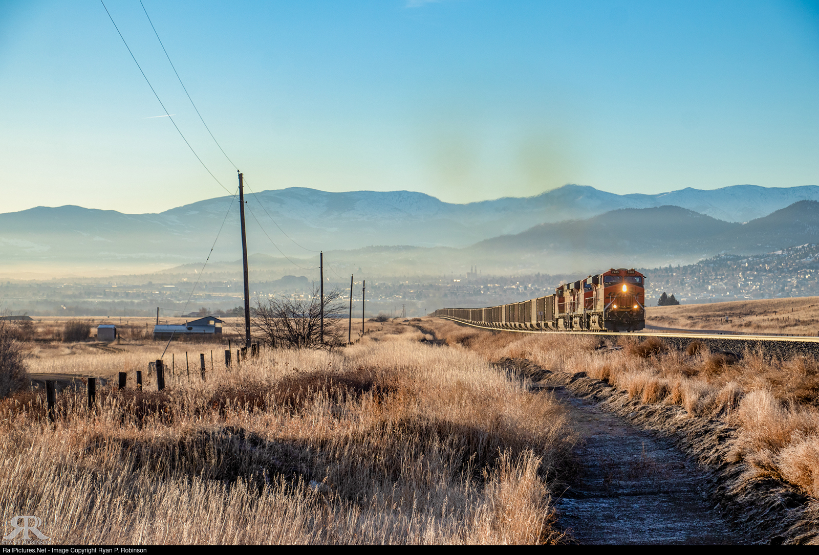 Shortly after sunrise, BNSF C-SCRMRBC0-45F has mid-train helpers cut in and they have begun their climb out of Helena towards Mullan Pass. Notable buildings of the Helena skyline can be seen in the distance. Carroll College is at left, followed by the dome of the Montana State Capitol Building at center, and Cathedral of Saint Helena at right.