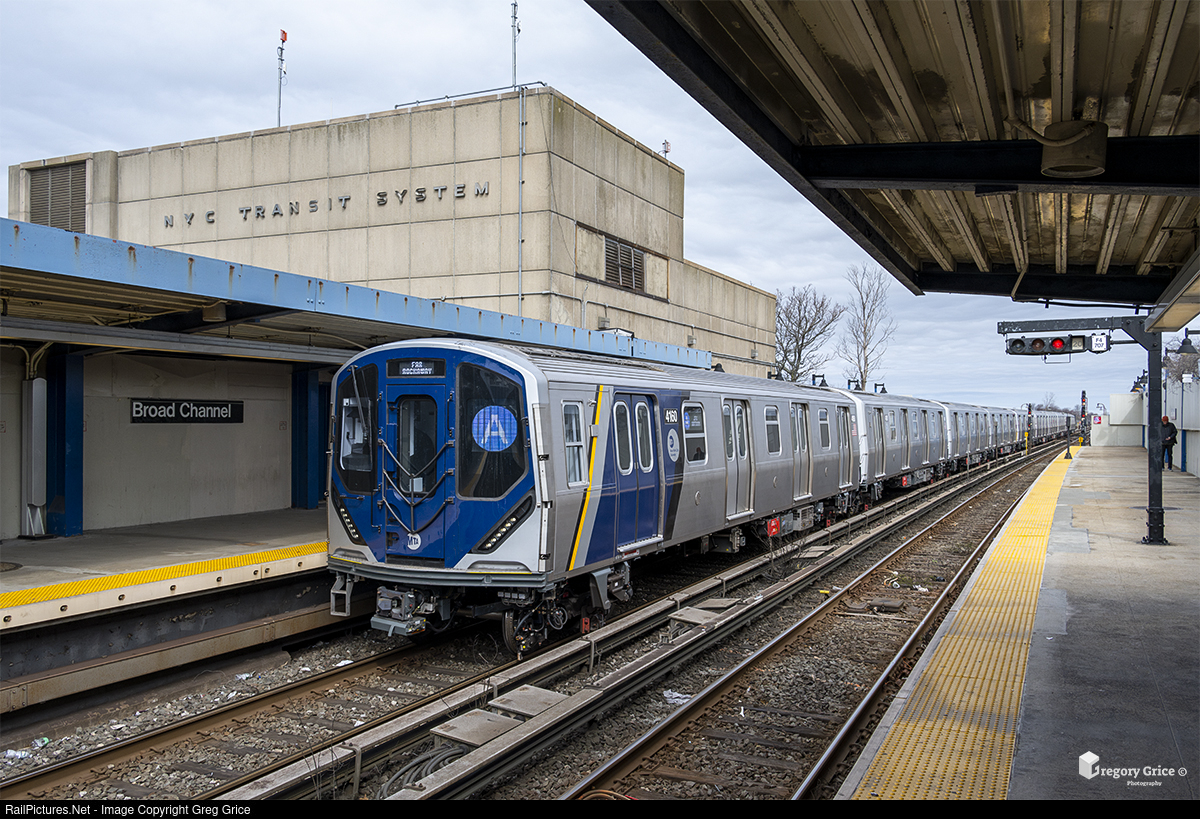On the afternoon of March 26th, 2024, a 10-car train of Kawasaki built MTA New York City Transit R211A subway cars pulls into Broad Channel station on the IND Rockaway Line in Queens, NY.