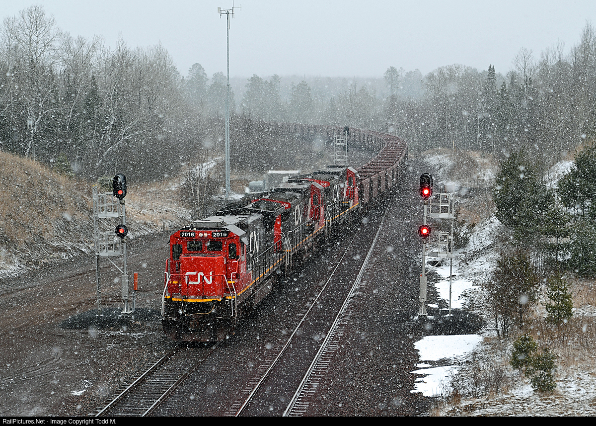 | An unusual winter that saw very little snow fall across NE Minnesota, today was an exception rather than the norm with heavy snow falling as CN 2016 takes the siding at Biwabik for a meet. |