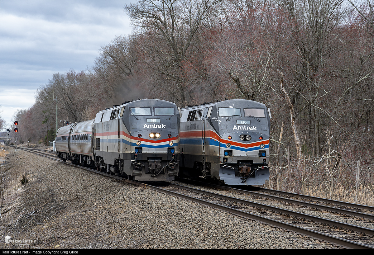On April 6th, 2024, Amtrak Phase III Heritage P42DC 145 leads southbound Hartford Line Train 463 at Hayden Interlocking on the MRS (Hartford) Line in Windsor, Connecticut as Train 460, shoved by Phase II Heritage P42DC 130, holds on the adjacent track.