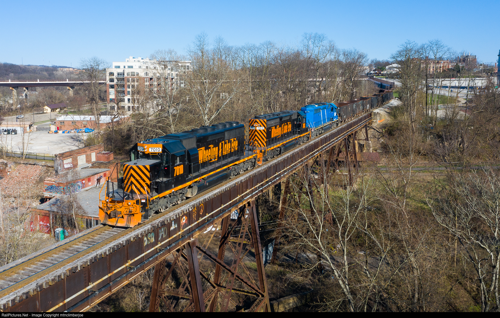 | The Akron Barberton Cluster's South Akron Job crew lead a trio of Wheeling & Lake Erie SD40-2's as they take headroom on the trestle over the Ohio & Erie Canal's cascade valley in Akron, Ohio. This train of stone empties is pulling off the connection from the CSX New Castle Subdivision and on to the WLE Akron Subdivision, where the cars will be tied down in the siding and the power taken to Brittain Yard. |