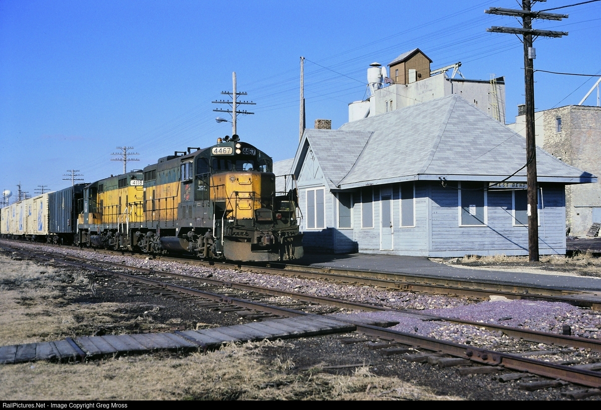 CNW 4467 brings the Eden Turn thru West Bend, WI in March of 1988. The train is on the CNW Air Line. The FRVR would acquire this line later in the year. The WC took over in 1993 and abandoned the West Bend to Eden segment in 2000.