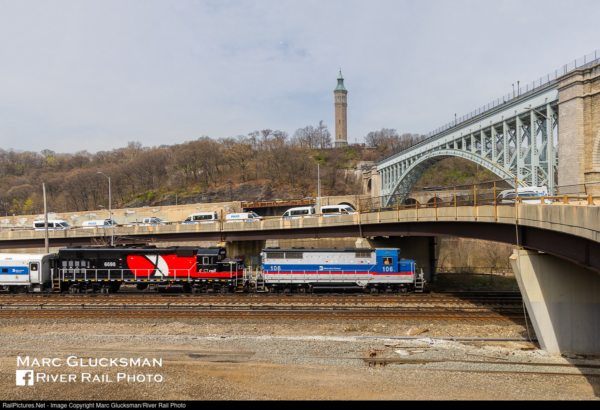 One Geep, Two Geep, Red Geep, Blue Geep. Sometimes the headlines writes itself as MTA Metro-North Railroad's AMMO crew uses MNCW GP35r 106 (née-PRR 2274, GP35, 5/1964) to tow a "mini-bomb" (3 Bombardier coaches) led by leased CTrail GP40-3H CTDX 6698 (ex-CSX 2181, exx-SBD 2181, née-CRR 2001, GP38, 4/1967) towards Depot Place and the High Bridge in the Bronx, New York on Wednesday, April 10, 2024. Due to a mechanical problem, the locomotive was en route to the Metro-North Croton Harmon Facility for repair. The CTrail locomotive is on lease to Metro-North, and can usually be seen operating on the Connecticut branch lines. The High Bridge opened in 1848, but was closed from 1970-2015. After a major rehabilitation, it re-opened to pedestrians June 9, 2015. It sits 140 feet above the Harlem River and unites Manhattan Island with the Bronx and thus mainland of the Unites States of America. It is also New York City's oldest existing bridge, pre-dating the opening of the Brooklyn Bridge by 35 years. With this morning view, the 200-foot tall Highbridge Water Tower in Manhattan also comes into the photo.