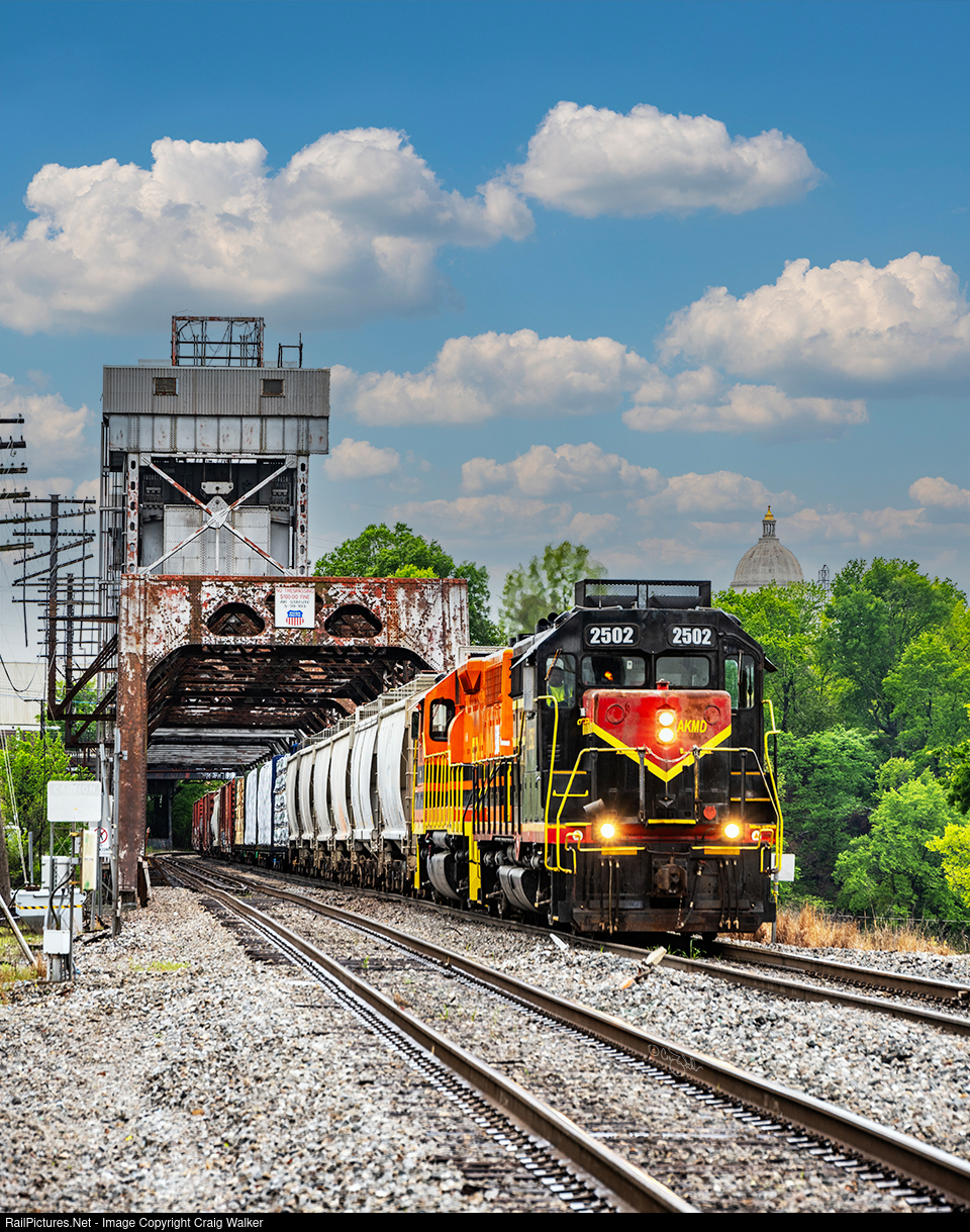A Little Rock & Western Railway northbound freight, LRWN 101-10, crosses the Arkansas River on the Union Pacific's Baring Cross drawbridge. (While operating on the UP, this train's symbol is UP LNLNLJ-10.) Arkansas Midland Railroad GP38M-2 2502 and LRWN GP38-3 2152 are in charge of this train – both railroads are part of parent company Genesee & Wyoming's operations here in the state. AKMD 2502 is a former GP35, ex-KRR 3502, ex-TOE D22, ex-WEYX 308, ex-SP 6626, née-SP 7729. LRWN 2152, meanwhile, was a GP38 with this history: ex-KRR 3862, ex MNA 3862, ex-TNER 3862, ex-TNER 5060, ex-CSX 2060, née-CO 3860. The Baring Cross Bridge was built by Missouri Pacific Railroad in 1929 (replacing an earlier bridge destroyed in a flood), with the lift span added in 1967. Arkansas' Capitol Building looms in the distance. (North Little Rock, Arkansas – April 10, 2024)