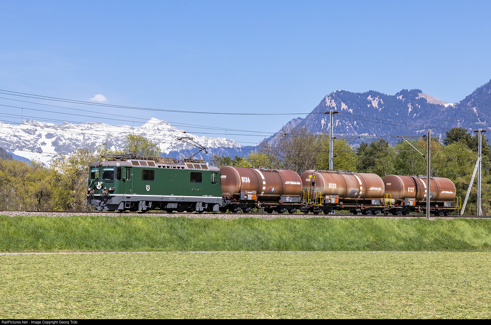 The Ge 4/4 II # 611 "Landquart" of the Rhaetian Railway with 1700 kw and a maximum speed of 90 km/h was delivered on June 30, 1973 as the first of its series by SLM and BBC, was green with chrome lettering and had round lower lamps on the front. With the delivery of the second series of Ge 4/4 II from 1984/85, the locomotives of the first series also gradually received the new red livery. In 2004, locomotive # 611 was the first of the series to receive rectangular lower headlights with integrated tail lights. From 2007, it was the first of the series to wear an advertising livery for Login, which was changed several times but remained in place until 2024. Now, on the initiative of the "Green and Chrome" foundation, the locomotive was more or less restored to its original condition by the RhB workshop in Landquart and presented in Landquart on april 12th, 2024. The locomotive is still in daily use on the Rhaetian Railway's main network and is also equipped with dual brakes and the new ZSI-127 train protection system. The coat of arms of Landquart with an upright walking ibex (capricorn) with a torch is effectively the coat of arms of the municipality of Igis, which together with Mastrils is now part of the municipality of Landquart. # 611 pulls freight train 5151 from Landquart freight yard via Chur-Thusis-Filisur-Samedan to Pontresina as very first train in green paint scheme again, between Chur and Felsberg, with 2965 meter high Schesaplana mountain in the background.