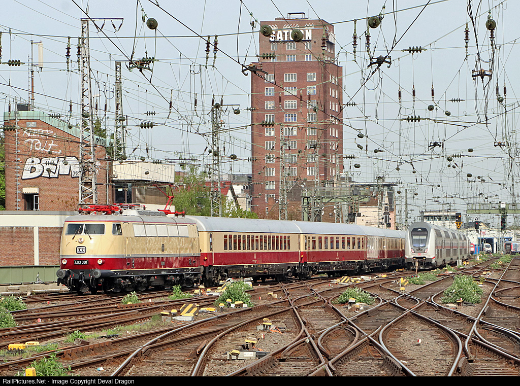 | The original Deutsche Bundesbahn Class 103 locomotive has been restored to its original Trans Europe Express Orient Red livery and leads an impressive charter train towards Köln.