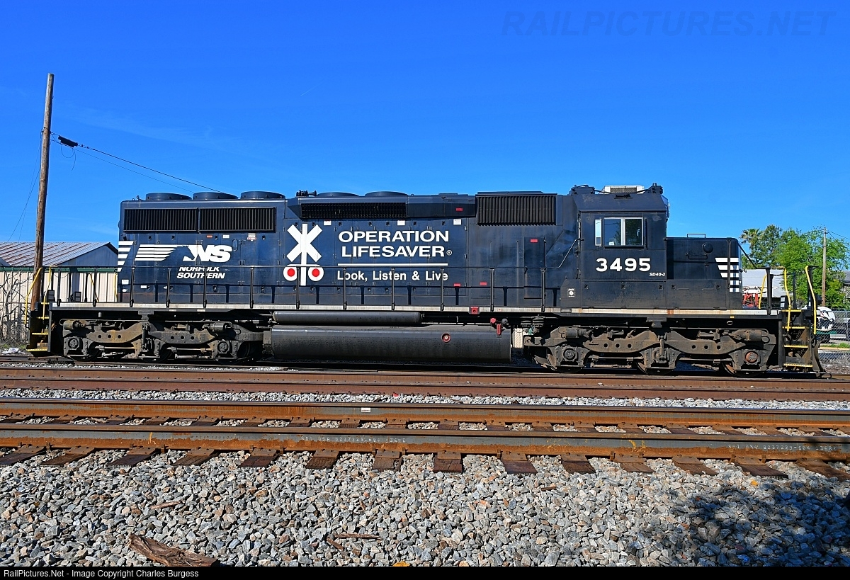 | This 1978 built General Motors unit is one of the last Operation Lifesaver painted locomotives active on the NS. Originally built for the Burlington Northern, NS 3495 was acquired from CIT Group in 2013 to supplement the Norfolk Southern six axle roster. |