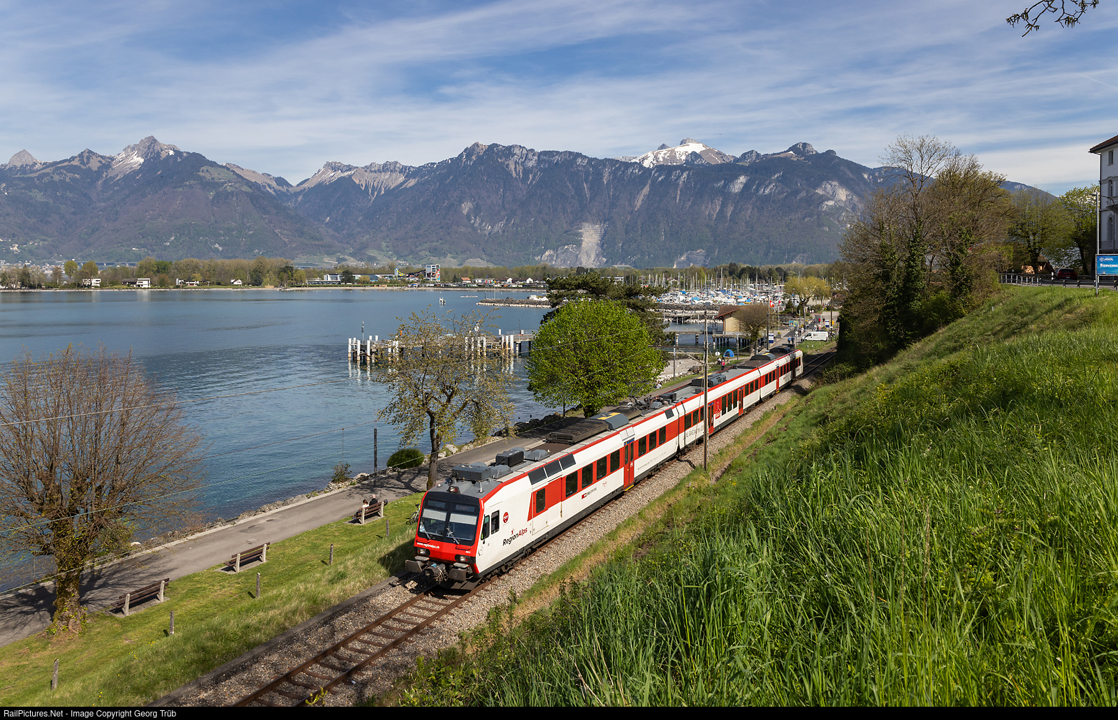 | "Domino" push-pull train of the RegionAlps with railcar RBDe DO 560 # 411 in Bouveret on the shore of Lake Leman, with the regional train 6122 of the line R91 from Brig via Sion-Martigny-St-Maurice-Monthey to St-Gingolph (Suisse). |