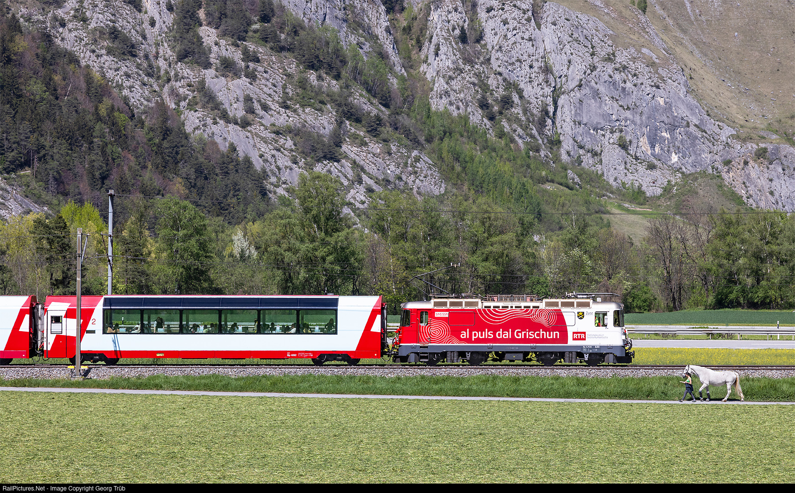 | Ge 4/4 II # 633 of the Rhaetian Railway in the "RTR" publicity paint scheme pulls the PE 902 GLACIER EXPRESS Zermatt-St.Moritz on the lap between Disentis and Chur, and is now between Felsberg and Chur. |