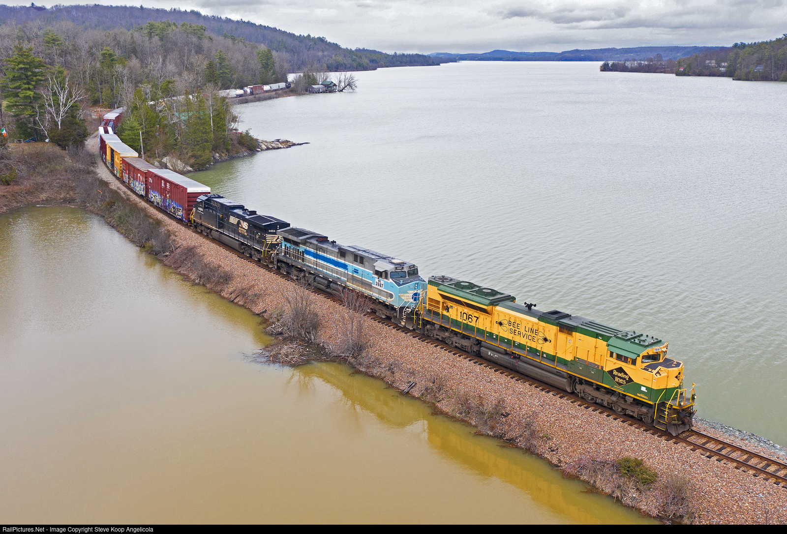 Double heritage as CPKC train 928 rolls along Lake Champlain at Putnam Station NY with the NS 1067 Reading and ex-CMQ NS 3987.