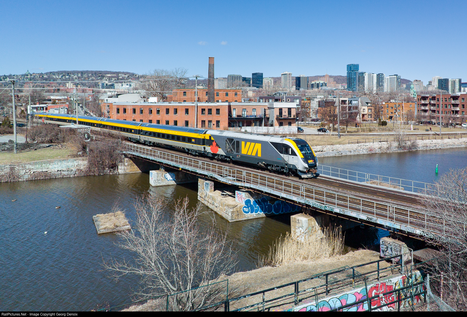 Now a regular sight on the Ottawa to Quebec runs, VIA's Venture set with n. 2204 leading crosses over Lachine canal, approaching Montreal's Central Station, to then continue to Quebec.