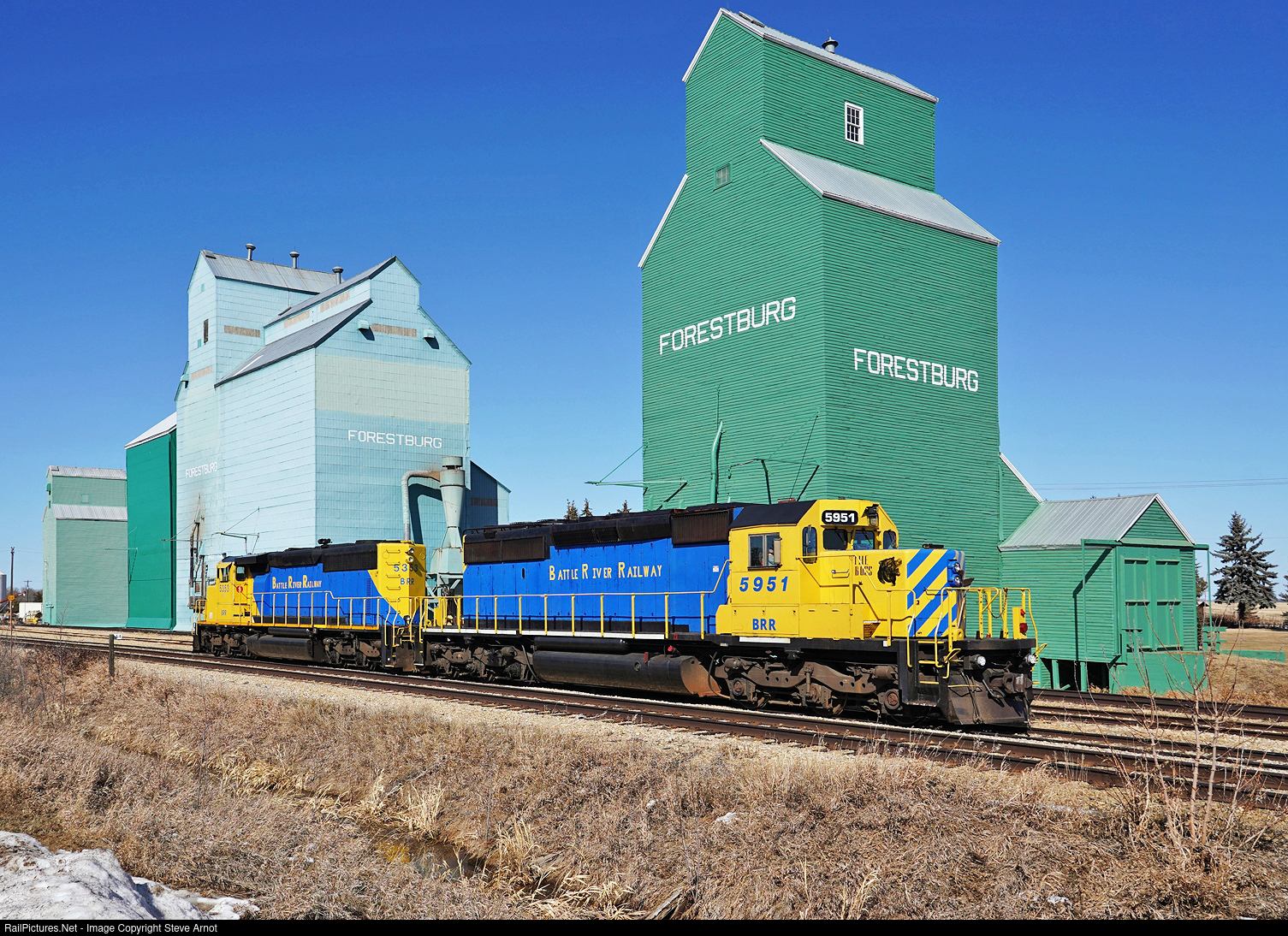 Battle River Railway's ex-CP Rail SD40-2 5951 and ex-CN SD40-2(W) 5353 make a light engine move past the former Alberta Wheat Pool grain elevators in Forestburg.