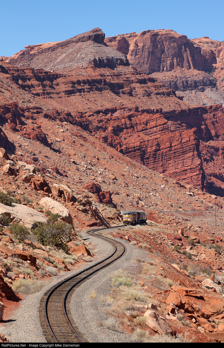 Rolling through beautiful Utah red rock country bordering Arches National Park, a 13-car Union Pacific Potash local approaches multiple curves nearing Emkay, Utah, on March 4, 2012. This is a former Rio Grande branch is now Union Pacific’s Cane Creek Subdivision.