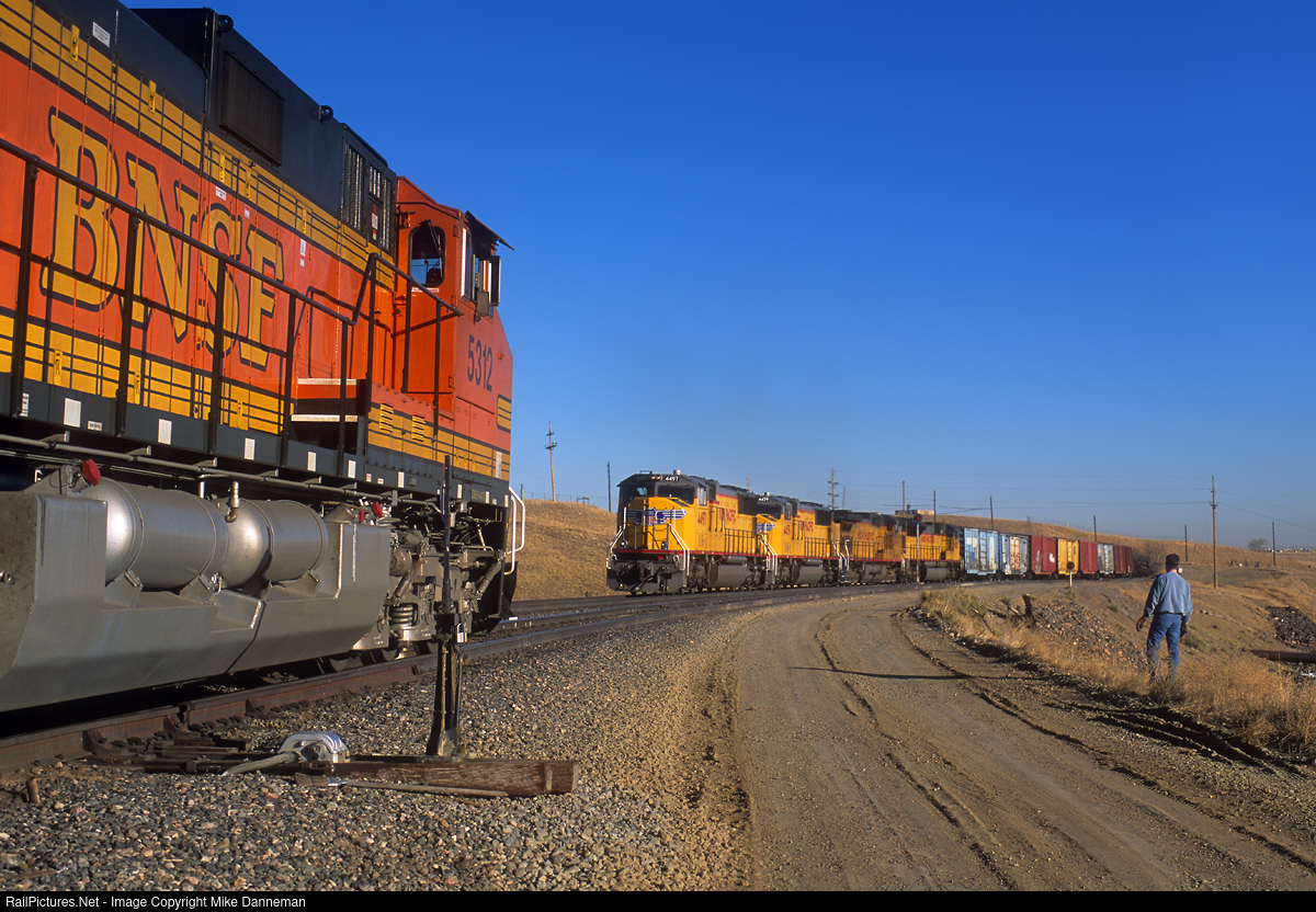An eastbound BNSF freight is in the clear in the siding at Rocky, Colorado, on January 19, 2002, and a man is on the ground to inspect Union Pacific’s MDVRO working west on the main line.