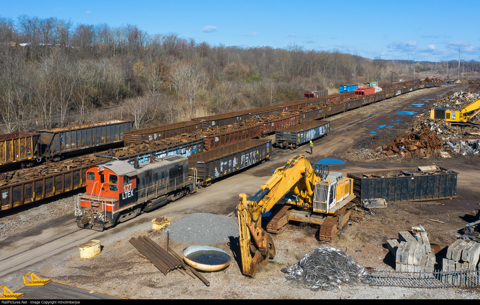 | A leased LTEX SW9 shuffles scrap gons at the Midwest Steel & Alloy scrapyard in Youngstown, Ohio located alongside the CSX New Castle Subdivision. The crew has just run these two cars over the rail scale to record their current load levels and is now coupling the cars back together for additional loading. |