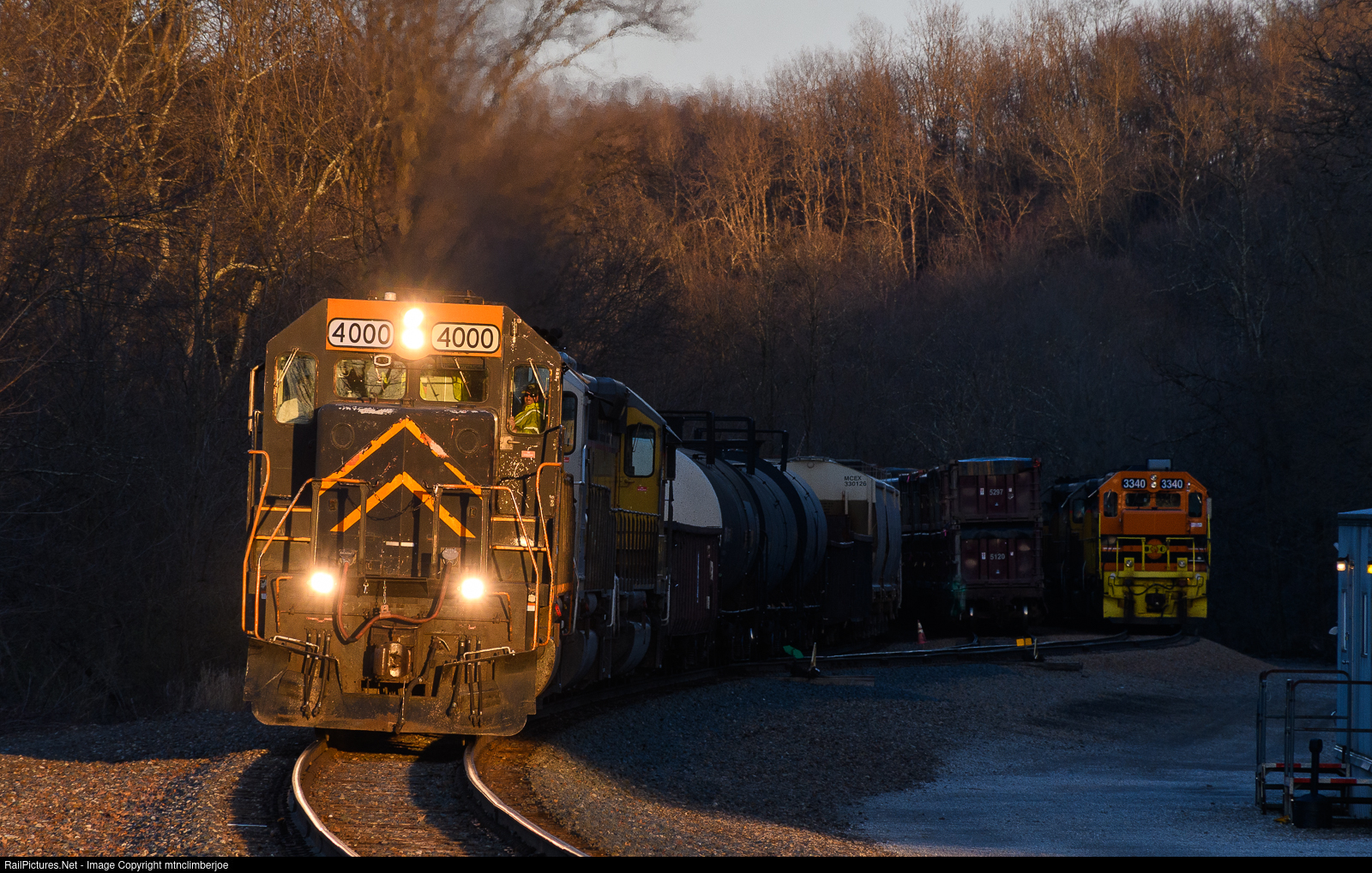 | A detouring Wheeling & Lake Erie train catches the last rays of the setting sun as it slowly rolls through the Ohio Central's yard north of Hopedale, Ohio at the junction to the Nelms Branch. This WLE train is currently using the Ohio Central's CUOH Pan Subdivision to detour around its own trackage between Mingo Junction and Jewett due to track work on the connection to the yard at Mingo Junction. Once at Jewett, the train will be back on its typical routing, using shared trackage until Bowerston where it will return to home rail. |
