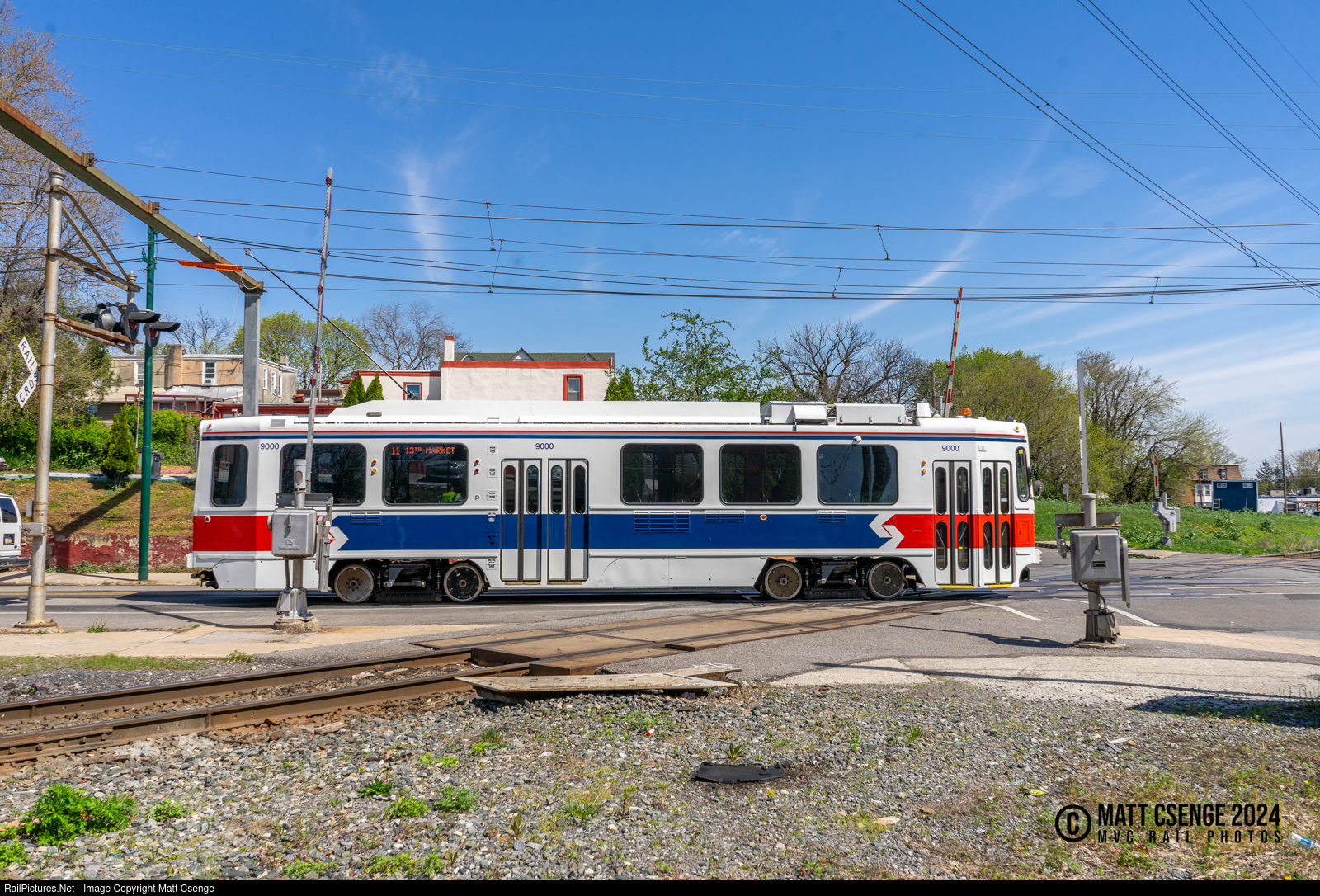 Southeastern Pennsylvania Transportation Authority (SEPTA) Type K car no. 9000 is seen crossing the CSX Philadelphia Subdivision at Main St and 6th St in Darby, PA. This is the only location in the SEPTA system where trolleys cross railroad tracks at grade, and yes there has been at least one accident between a trolley and a train at the crossing! |