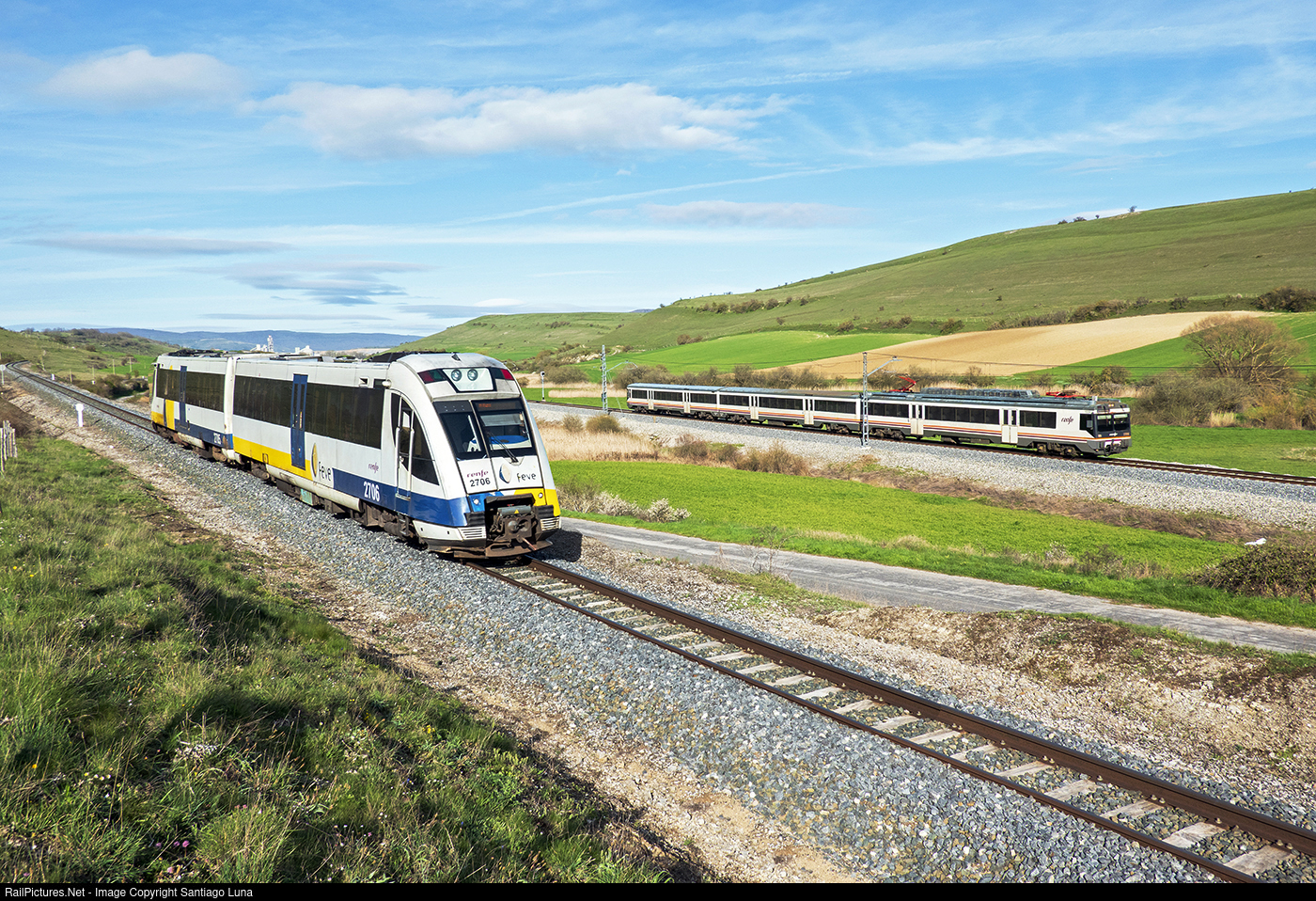 At this point in Mataporquera, the Bilbao-La Robla Line (metric gauge) and the Santander-Palencia Line (Iberian gauge) coincide. Sometimes you can see two trains circulating simultaneously, like in this photo where we see the Bilbao-León Regional in the foreground and the Santander-Valladolid Regional on the right.