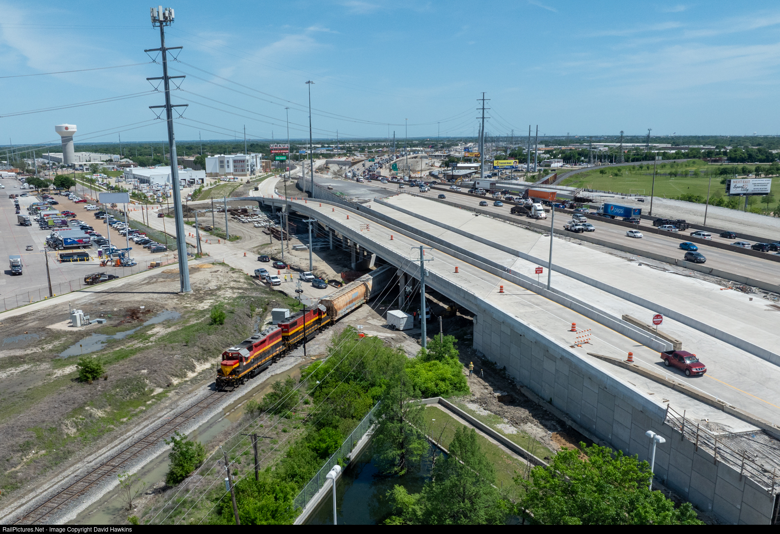 Met 1 heads out of Dallas yard to work industries on the White Rock branch and Interstate 635 getting wider day by day.