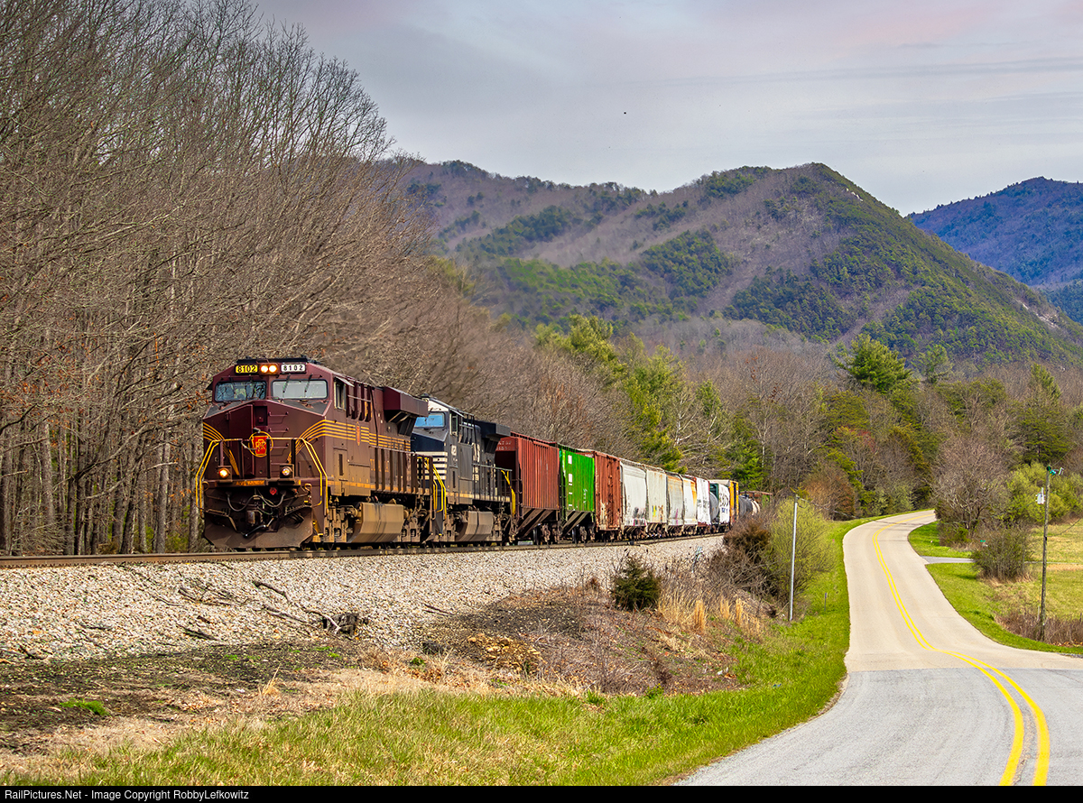 NS 8102, the Pennsylvania Railroad Heritage Unit, leads manifest 12Z northbound toward Mount Joy Lane in Raphine, Virginia, along the NS Hagerstown Line.