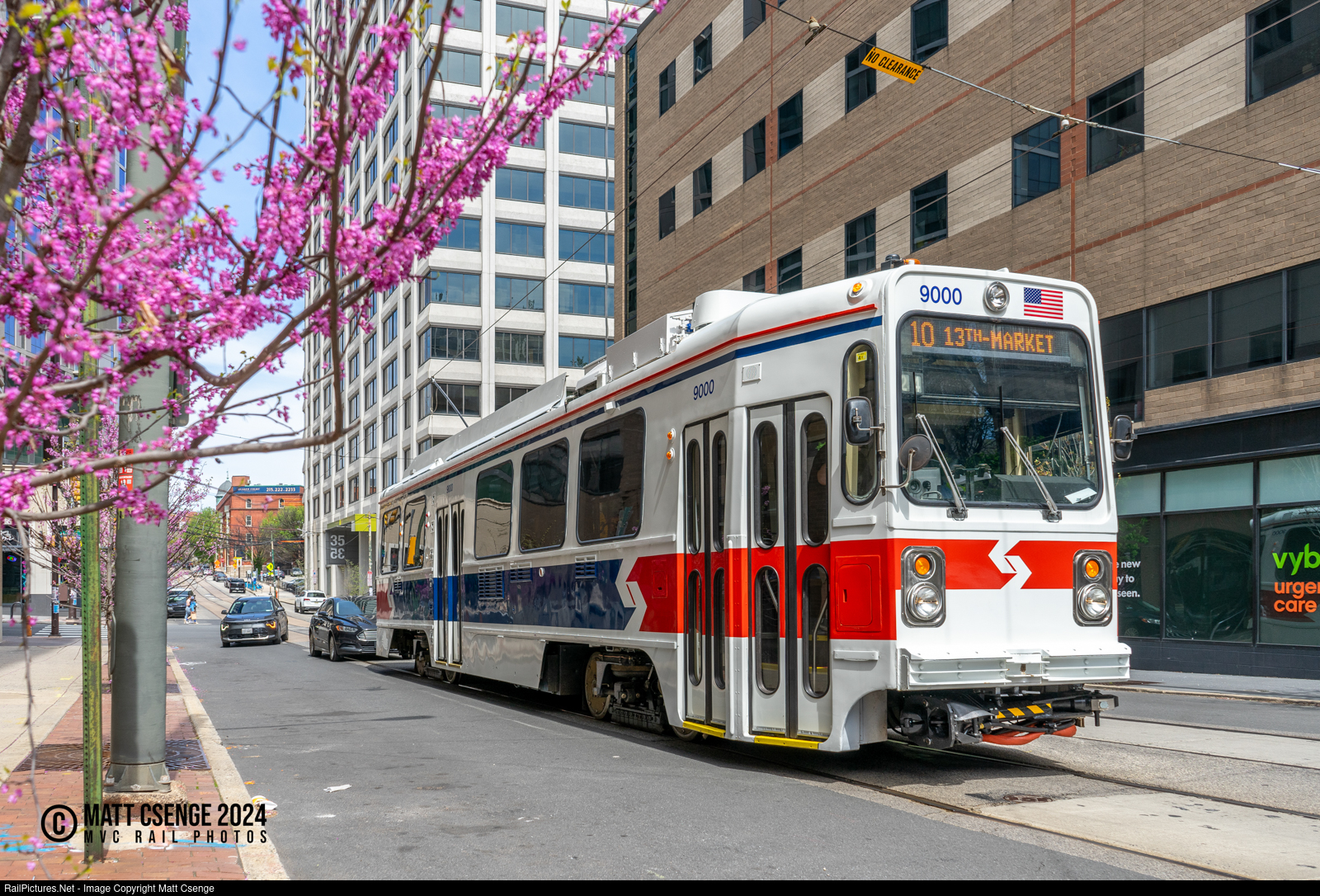 On Sunday, April 14, 2024 the Friends of Philadelphia Trolleys ran a special charter trip with Southeastern Pennsylvania Transportation Authority (SEPTA) Type K trolley no. 9000. Here we see the car waiting to turn into the 36th St Portal, with some nice spring blossoms nearby! |