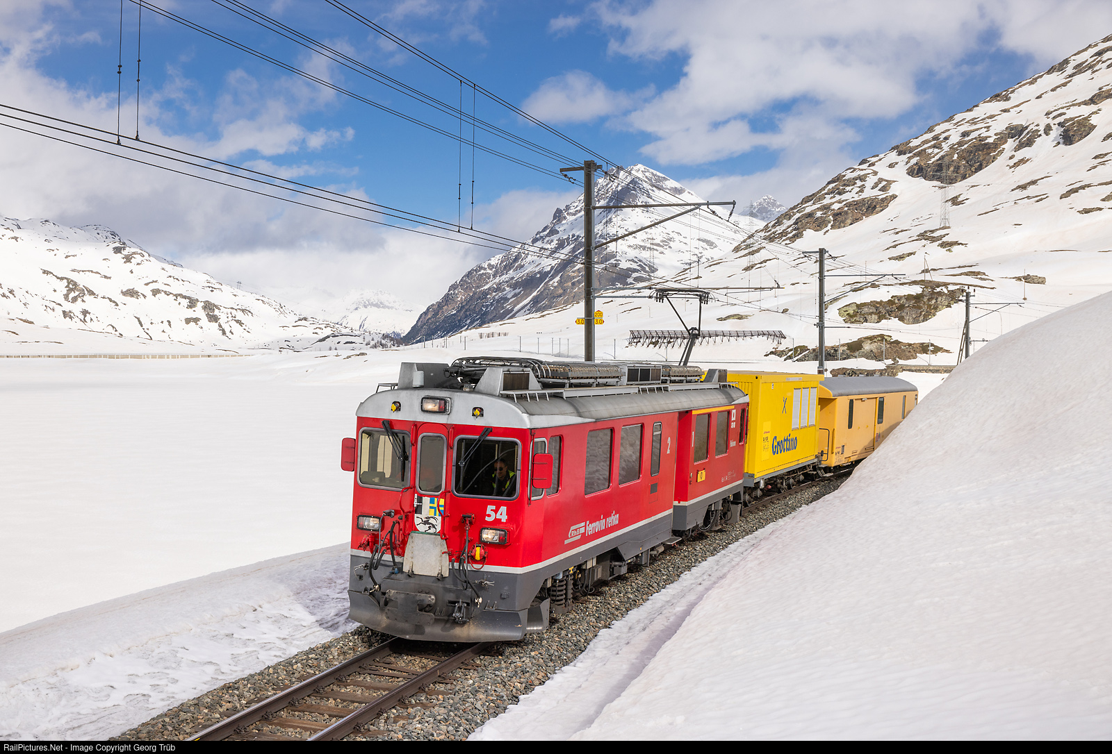 | The "Tw III" ABe 4/4 # 54 of the Rhaetian Railway arrives at Ospizio Bernina as train 9619 from Pontresina to Poschiavo. In mid-April, it is still real winter here at around 2250 meters above sea level. The train with the two coaches Xk # 9350 crew coach "Grottino" from 1934/1998 and the equipment car Xak # 9460 from 1969/2003 (former post car Z # 99) is used to train an infrastructure driver. In future, Infrastructure will use the ABe 4/4 # 56 railcar for service trains. The ABe 4/4 # 54 "Hakone" railcar (the Japanese railroad company Hakone Tozan Tetsudo is a sister railroad of the RhB) was built in 1990 by Schindler Waggon Pratteln (SWP) and BBC and is to be preserved as a historic operational vehicle for the Bernina line.