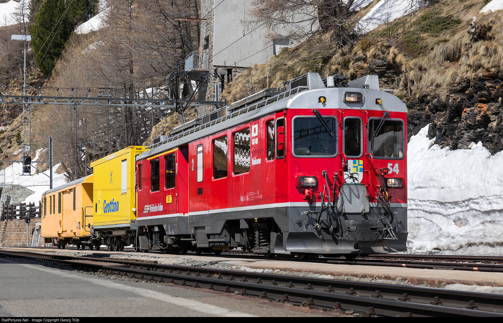 | The "Tw III" ABe 4/4 # 54 of the Rhaetian Railway in Alp Grüm with service train 9653 to Poschiavo, with cars Xk # 9350 "Grottino" from 1934/1998 and tools car Xak # 9460 (1969/2003 former post car Z # 99). The trip is used to instruct an infrastructure locomotive driver, as this department will be using the sister vehicle ABe 4/4 # 56 in the future. The ABe 4/4 # 54 "Hakone" railcar was built in 1990 by Schindler Waggon Pratteln (SWP) and BBC for the Bernina line and is to be preserved as a historic vehicle. The japanese "Hakone Tozan Tetsudo" railway is sister of the Rhaetian Railway. |