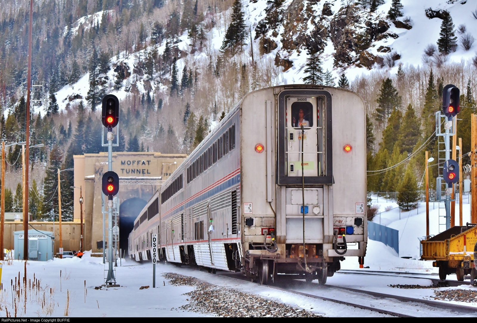 As a passenger watches out the rear window, the California Zephyr 5 train gets ready to enter the east portal of the Moffat Tunnel.