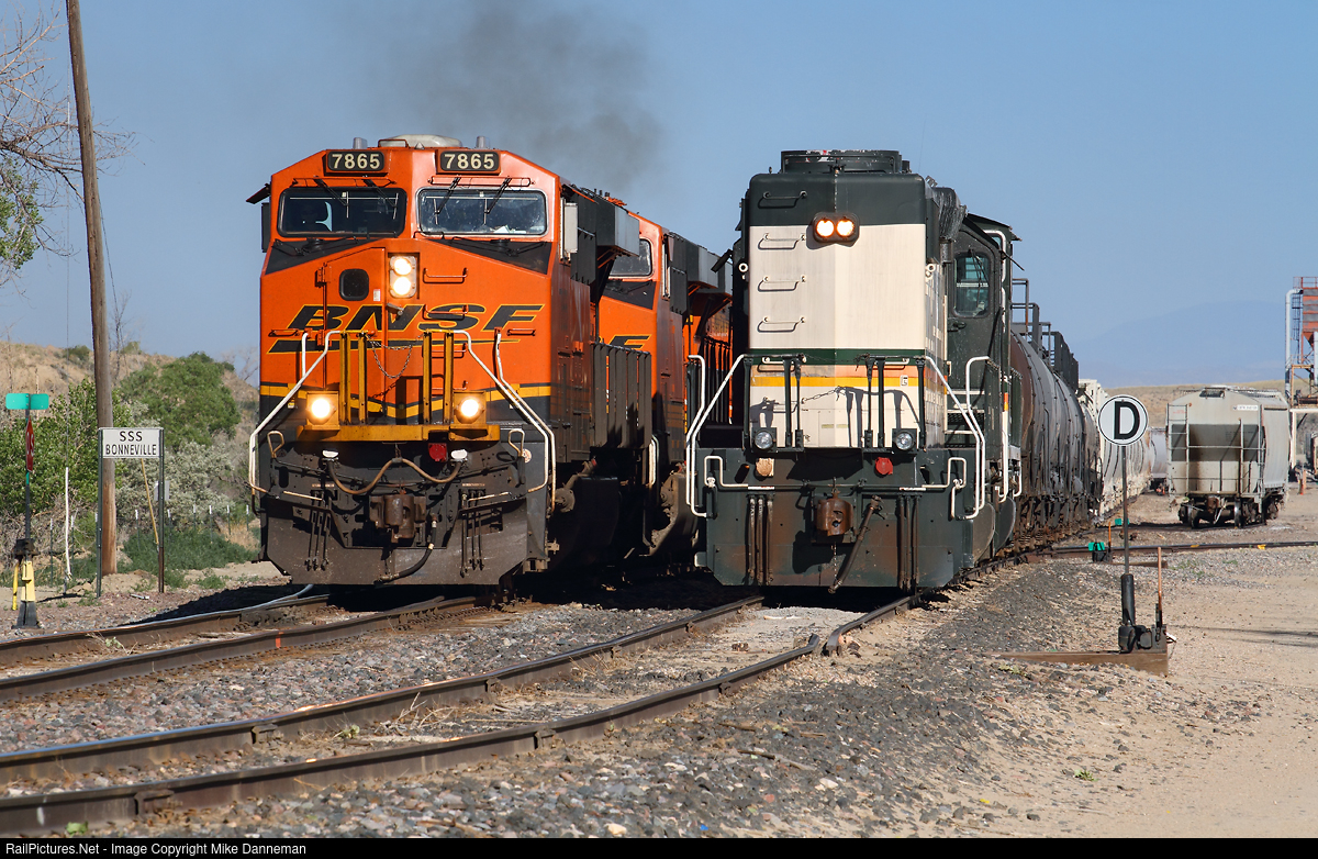 While Bighorn Divide & Wyoming Railroad EMD GP38-2 No. 2001 and SW1500 No. 1001 switch the yard at Bonneville, Wyoming, on June 22, 2016, a southbound BNSF freight passes the South Siding Switch of Bonneville siding on the Casper Subdivision main line.