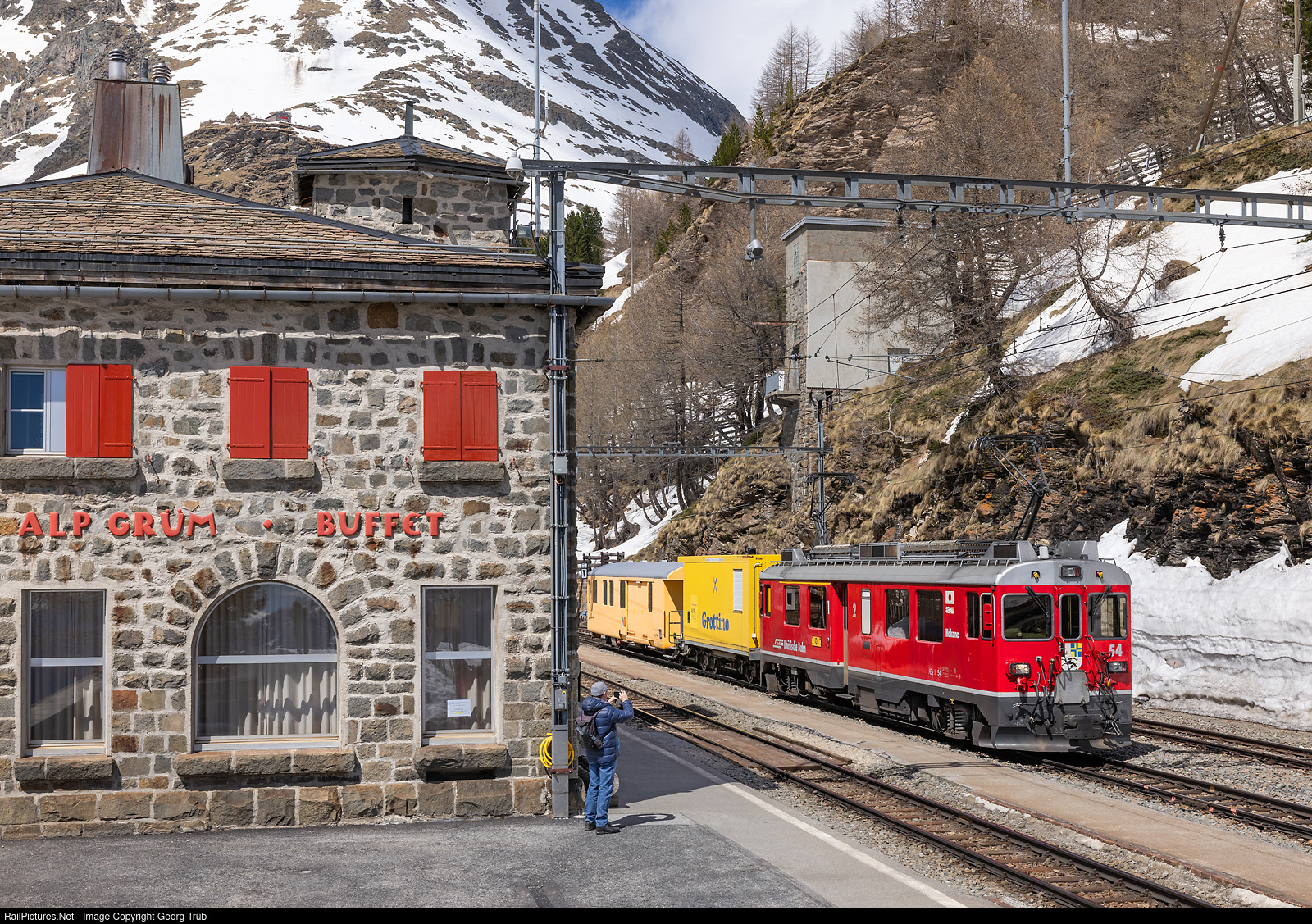 | The "Tw III" ABe 4/4 # 54 of the Rhaetian Railway is ready in Alp Grüm with service train 9635 to Poschiavo. The trip is used to instruct an infrastructure locomotive driver, as this department will be using the sister vehicle ABe 4/4 # 56 in the future. The ABe 4/4 # 54 "Hakone" railcar was built in 1990 by Schindler Waggon Pratteln (SWP) and BBC for the Bernina line and is to be preserved as a historic vehicle. Several "FairFotographers" have gathered to photograph/film the train. By paying a modest amount, the proceeds of which will go towards the preservation of historic vehicles, interested parties will be able to see the layout of certain special RhB trains. Taking this picture, the photographer was standing on a snow heap of about 2 1/2 meters.... |