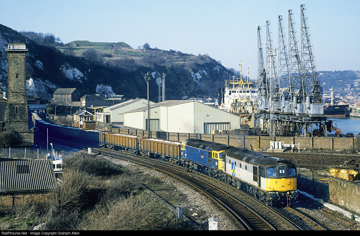 | 33053 and 33052 head the 6C56 1152 Grain - Shakespeare Cliff freight, conveying concrete lining segments for the Channel Tunnel, which was under construction at the time. |
