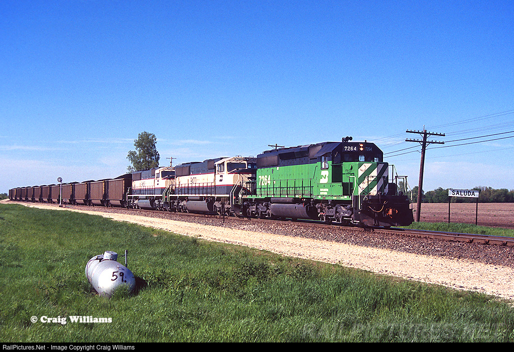 | The BNSF merger was getting closer to reality by May 1995. Galesburg was about to become a major hub in the east with this merger. Lots of things would change, but for now the BN was as is with this May 1995 slide of a coal train heading south of Galesburg with a transition consist of DC/AC power. The 1st BN SD70MAC was built in 12-93, and BN would get 350 of these units before the merger (9400-9749).