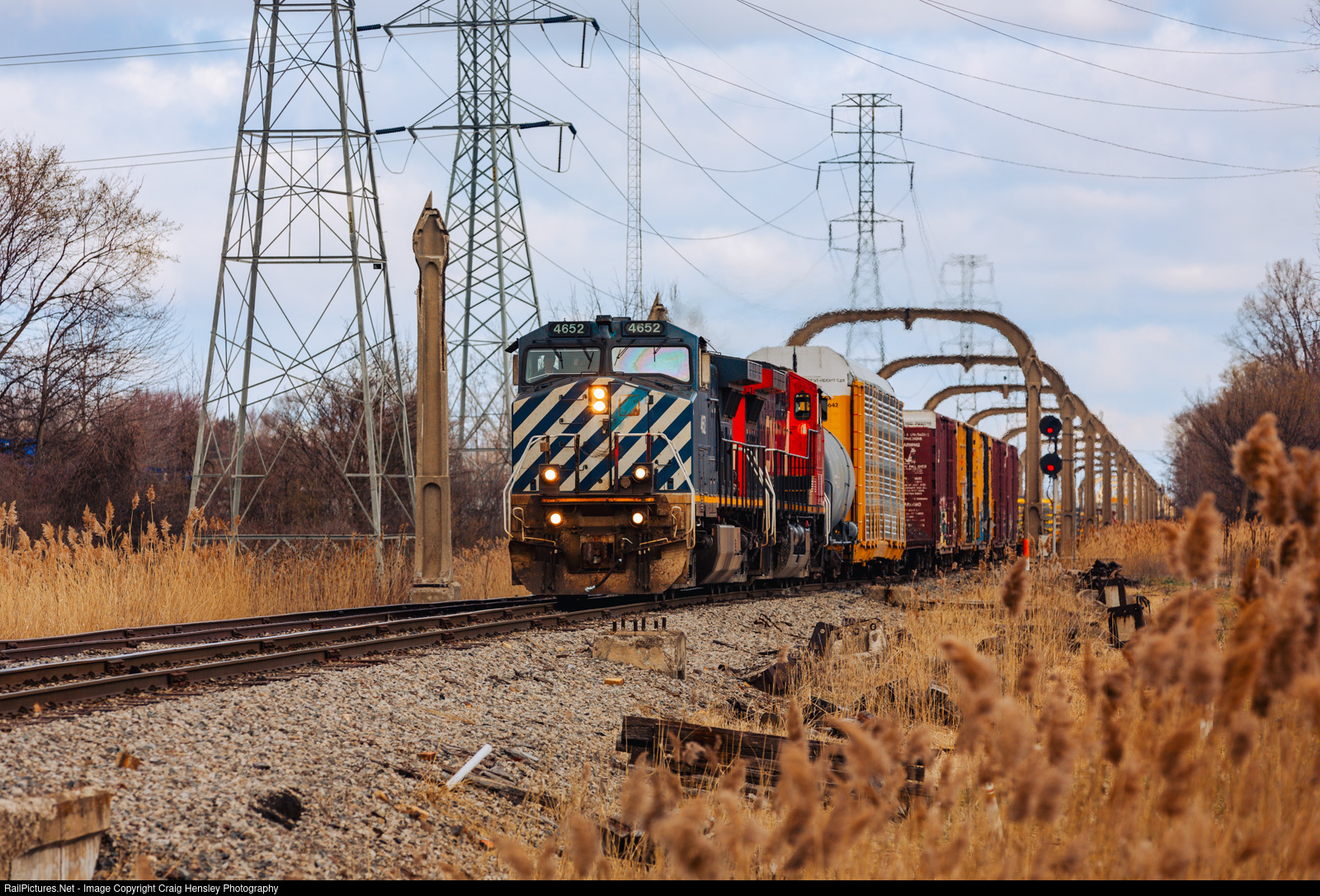 | BCOL 4652 in the blue scheme leads interchange train L572 from Norfolk Southern's Oakwood yard in Melvindale, MI through the arches and over the Penford diamond as they head back to CN's Flat Rock Terminal in Flat Rock, MI. |
