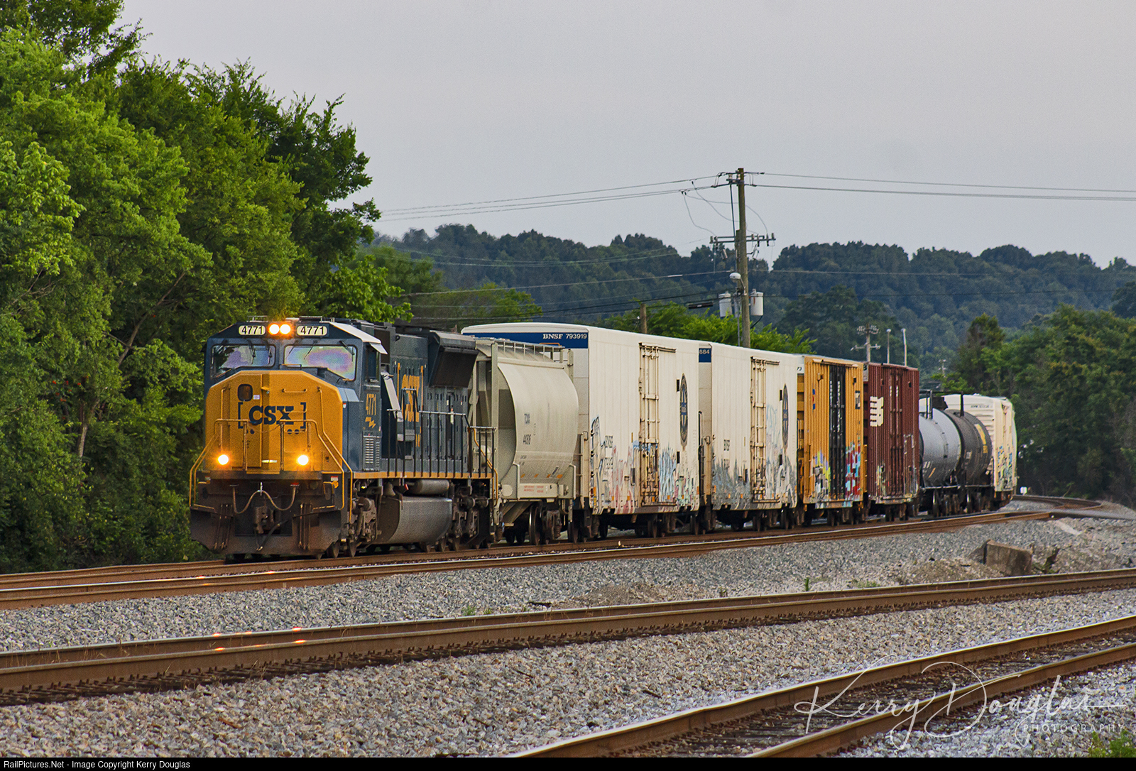 On a hazy humid June evening CSX Q580-07 (Atlanta,GA-Nashville,TN) is creeping north in the siding at Dalton, GA. In the Pre-PSR days Q580 was a daily run road local that took all the car that didn't get tagged onto Q582 north for Radnor Yard. This freight also made set-off at Carterville, Chattanooga, Tullahoma, Murfreesboro, and finally terminate out of Nashville. Depending on how many cars that were inbound for Chattanooga and Nashville this freight would normally be just under 30 or so cars. Seen here only with 12 cars tied behind a single motor the dispatcher had a full advantage in bringing this freight into the siding to meet a couple of southbound at the North-End of Dalton.