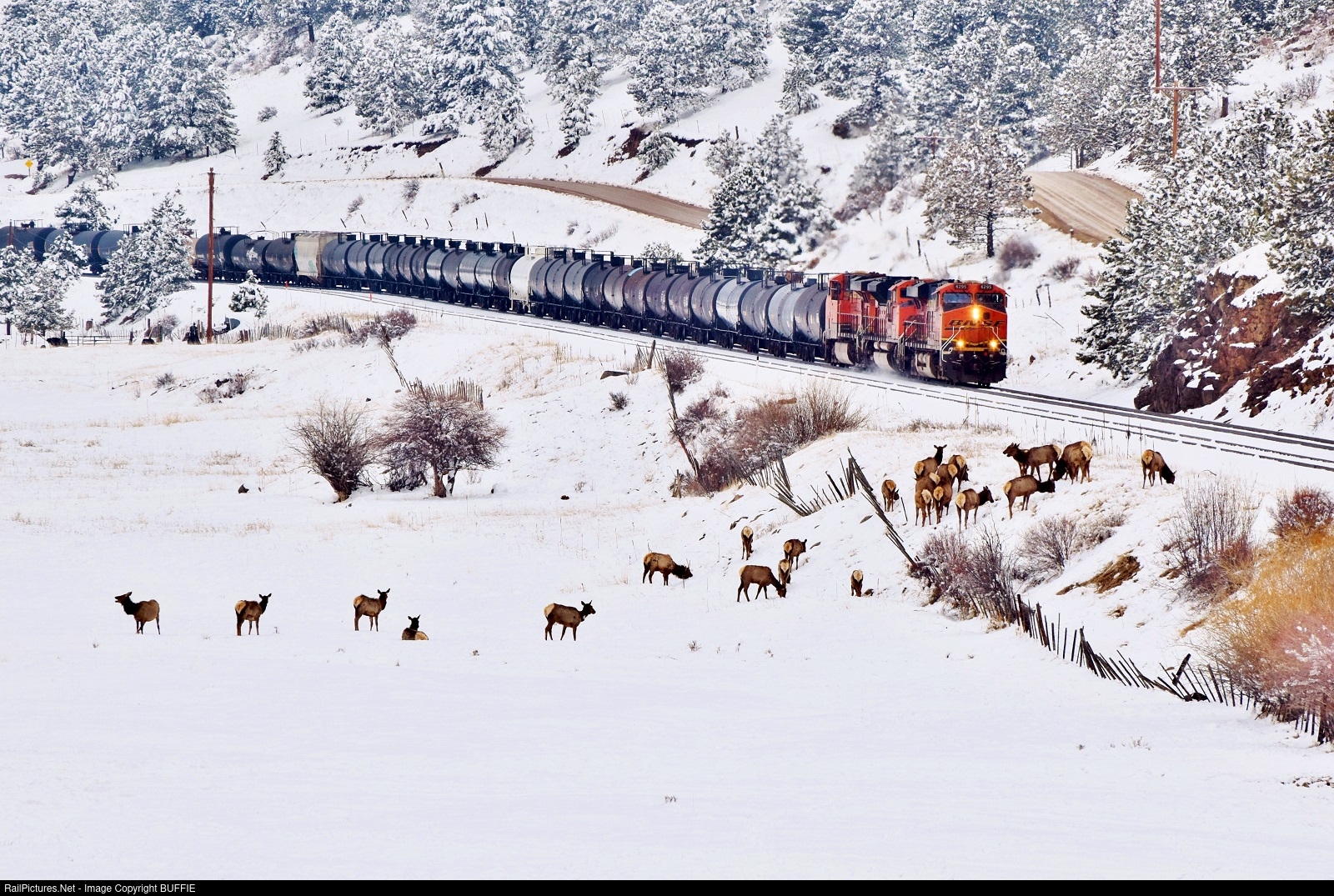 A large herd of elk greets BNSF 6295 (ES44AC) as it runs a freight through a foggy and snowy Rollinsville, Colorado on the Moffat Tunnel Sub.