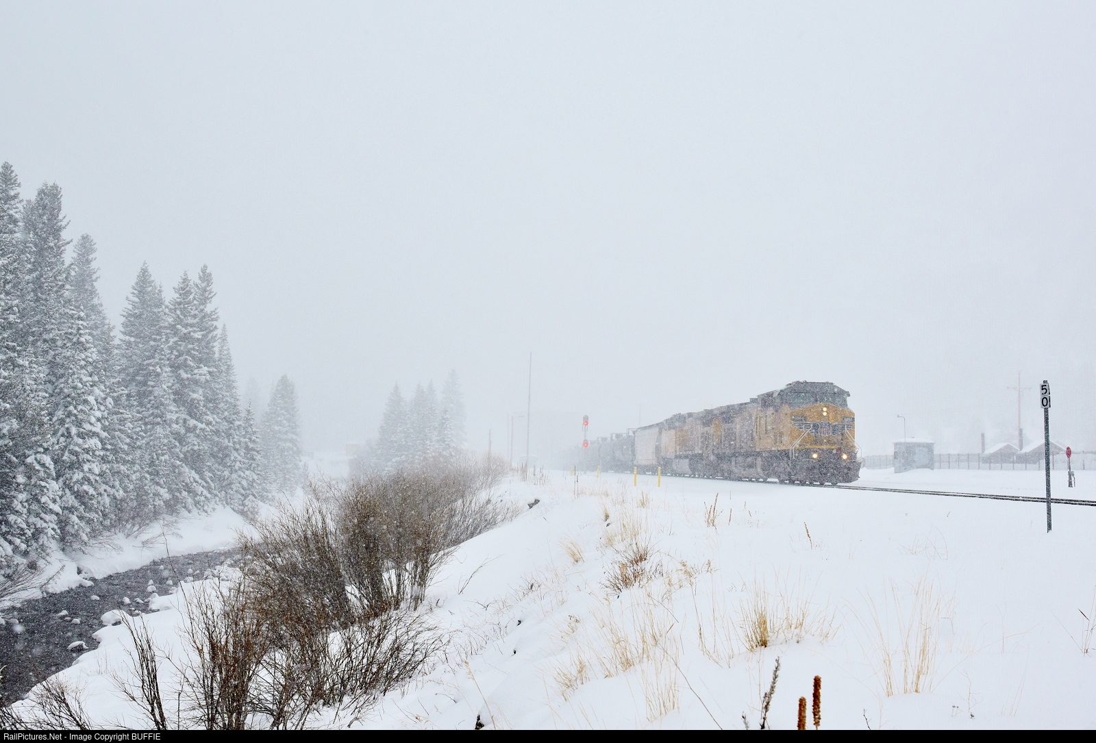 Heavy snow is falling at Tolland, Colorado, obscuring the east portal of the Moffat Tunnel from which UP 6864 (ES44AC) has just emerged.