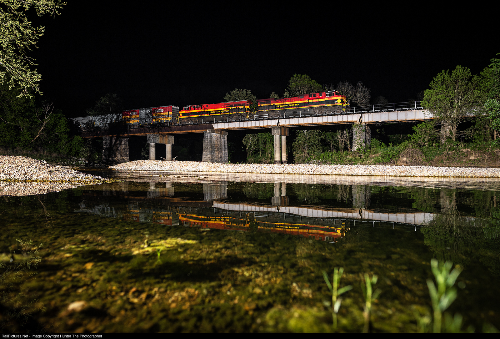 Belles After Dark | As the 11 o'clock hour nears, southbound CPKC intermodal train I180 crosses the Elk River at Ginger Blue, MO on a cool Saturday, April 20, 2024 evening. Just behind the locomotives, the KCS track geometry inpection car is visible.