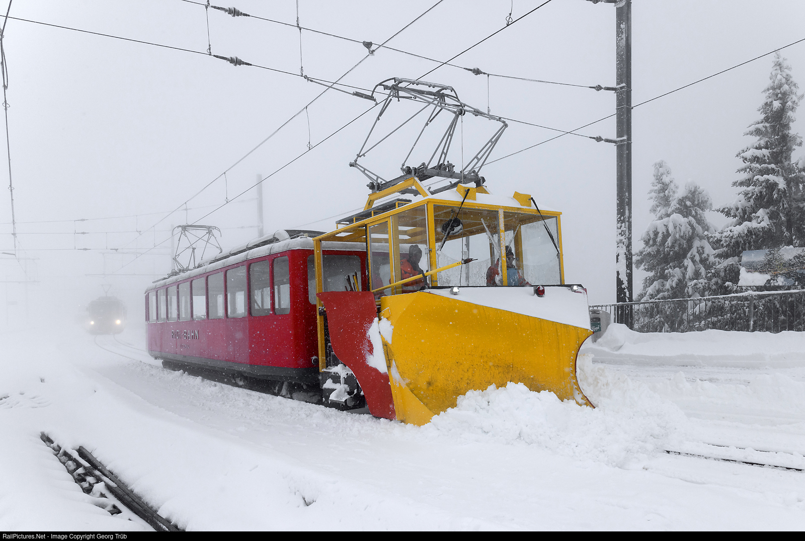 | Rigi Bahnen cogwheel railcar Bhe 2/4 # 2 from 1937 pushes the snowplow X # 102 on Rigi Staffel towards Rigi Kulm. The pantograph on the plow is used to scrape off ice from the overhead line. The plow was built in 1931 for the Vitznau-Rigi Railway (VRB) and rebuilt several times. |