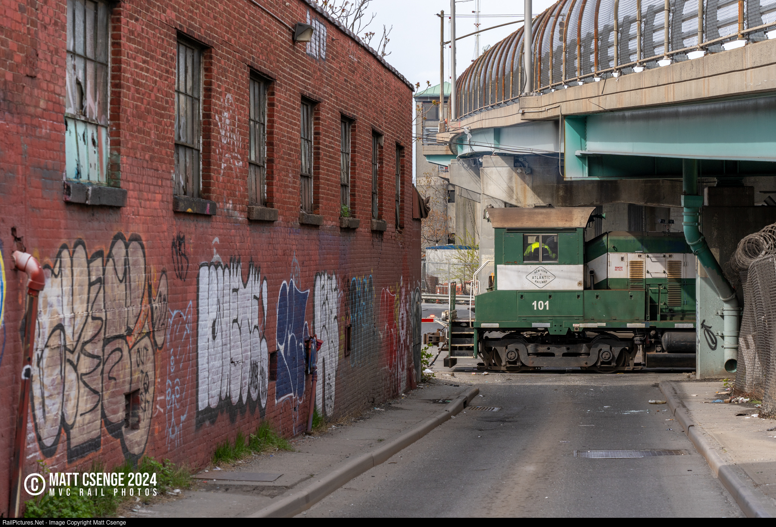 New York & Atlantic SW1001 no. 101 is seen moving train RS-40 through Long Island City, Queens as it serves industries along the Lower Montauk Branch. Overhead is the Greenpoint Avenue Bridge, crossing the Newtown Creek into Brooklyn in the background. |
