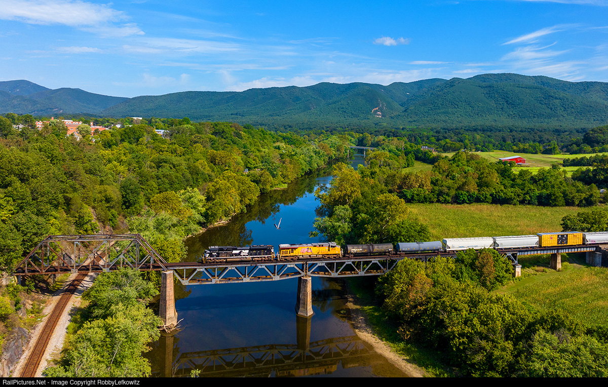 NS 1049 leads manifest train NS 14Z over the James River in Natural Bridge, Virginia, as it continues its journey north toward Shenandoah Yard along the NS Hagerstown District. |
