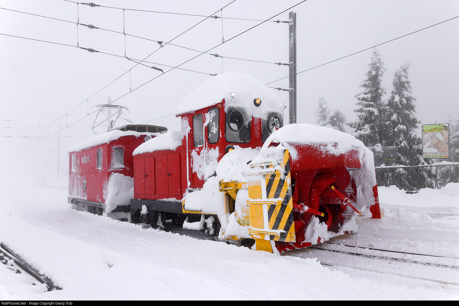 There was about half a meter of fresh snow on the Rigi mountain, almost more than ever this winter. The electric locomotive He 2/2 # 18 of the Rigi Bahnen from 1938 (SLM and BBC) with the diesel snow blower Xrotm # 1 from 1974 (Raco, Deutz, Beilhack) in Rigi Staffel.
