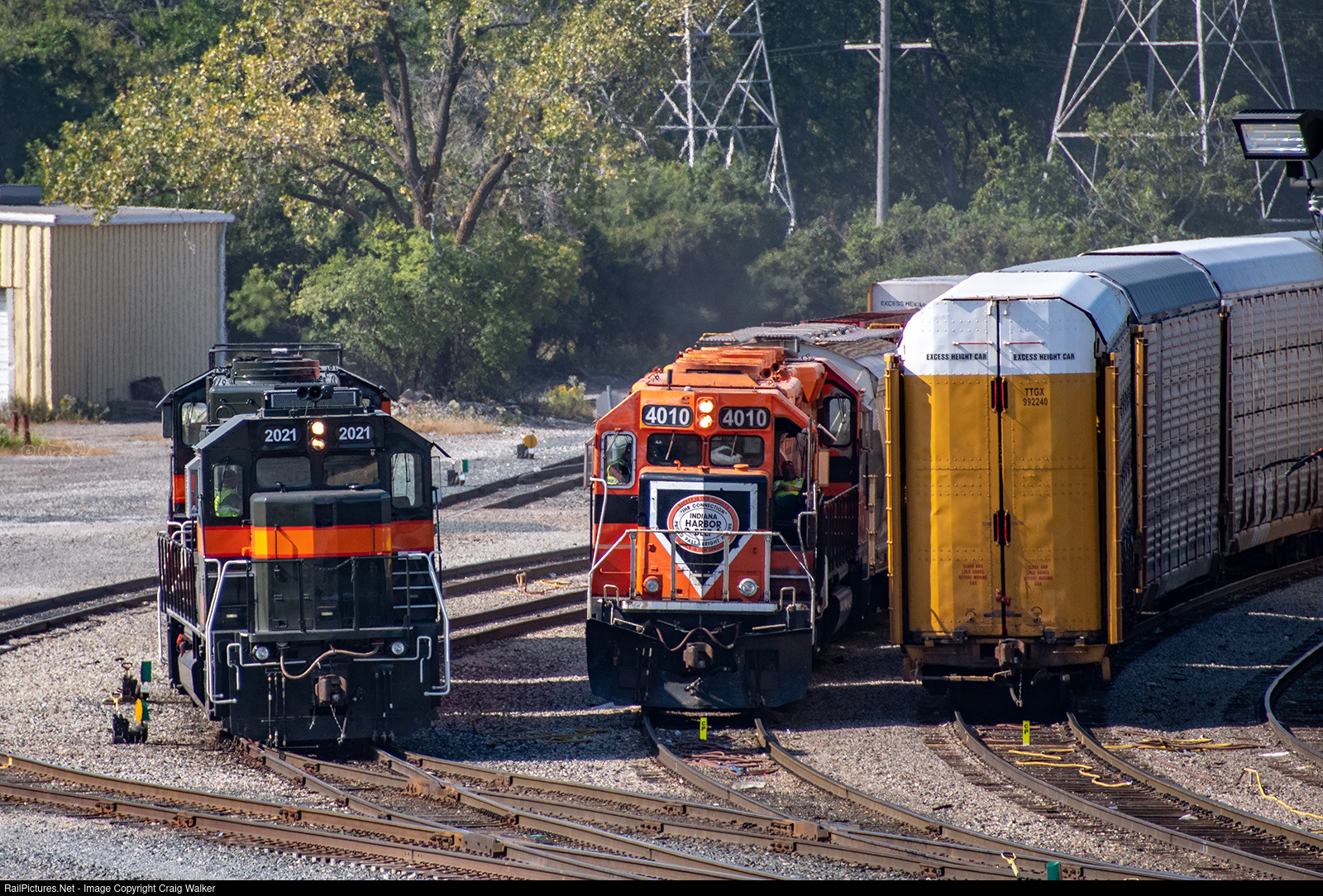 Indiana Harbor Belt GP40P-2 4010 (ex-Southern Pacific 7600; née-SP 3197) and GP40-2 4012 (ex-Union Pacific 1303, née-SP 7625) work the railroad's Blue Island Yard, as IHB slug 2021 (ex-IHB 3GS21B 2143, rebuilt into a slug after ten year of service) and GP40L 4021 (ex-YVRR 9552, née-Canadian National 9552) move a string of freight cars on an adjacent track. IHB 4010 is one of only three GP40P-2s ever built, all for the Southern Pacific's Bay Area commuter trains, and this is the former SP Bicentennial unit. (Hammond, Indiana - September 27, 2021)