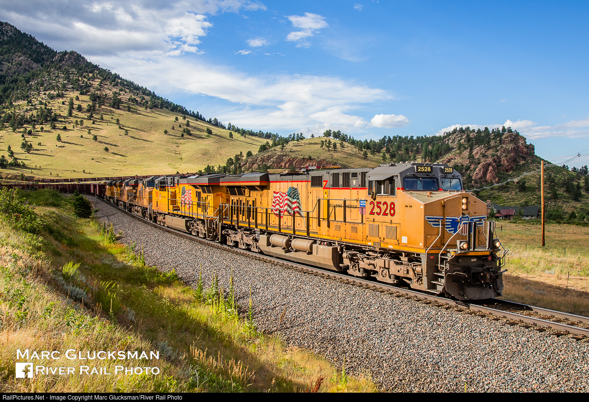 | Wrap Around Photo. Union Pacific Railroad 2528 (ES44AC-H/C45AH) leads a robust six-pack of power through Coal Creek Canyon approaching Blue Mountain Drive in Aravada, Colorado on July 28, 2020 with a lengthy train of empty Herzog ballast gondolas. This area is filled with endless possibilities of different angles for photos as the track twists and turns from the tunnel just out of view and through the Big Ten Curve ahead. Trailing DPU UP 7388 (ES44AC/C45ACCTE) is just above the leading locomotive in the photo about 4/10 of a mile away as the crow flies but almost a mile by track. |