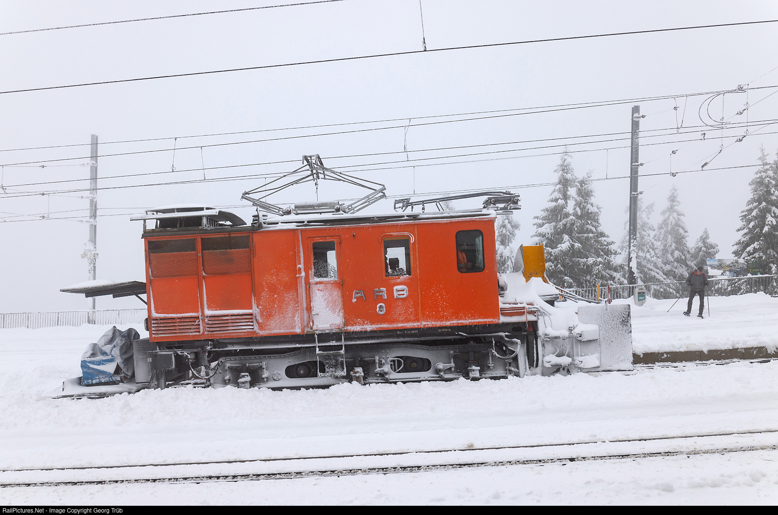 Electric cogwheel snow blower locomotive He 2/3 # 8 of the Rigi Railways (RB) in operation on Rigi Staffel. There is more snow than ever this winter towards the end of April. The three-axle locomotive was built in 1930 by SLM and MFO for the Arth-Rigi Bahn (ARB). The locomotive body with the skidding unit can be turned 180 degrees on the chassis.