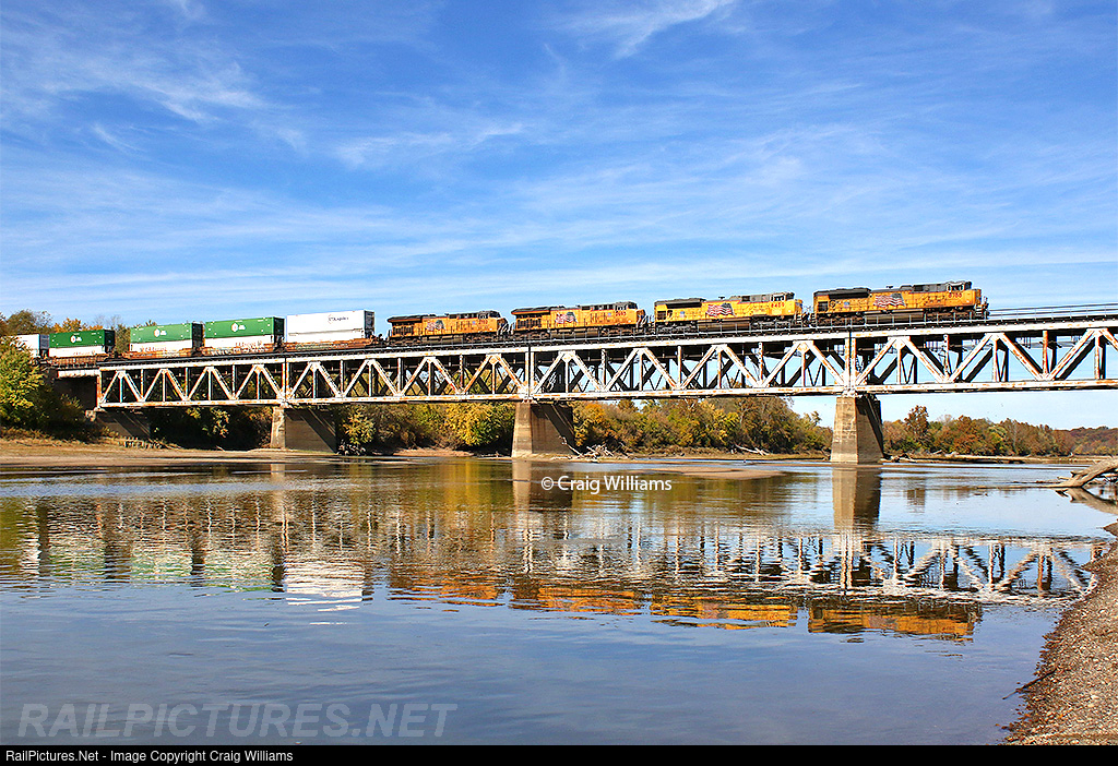 | Spent a beautiful morning along the Marceline Sub at the Des Moines River Bridge back in October. I know it's the Transcon, but we had a blast enjoying the nice October day. Surprisingly, the BNSF ran a few odd ball consists that were neat. The UP had their pairs of train pass thru each way around lunchtime. This one had a decent consist. |