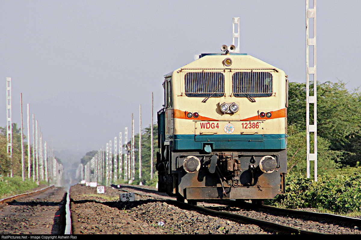 A light loco from Gooty WDG4 #12386 at Manjari Budruk. This was the time when the electrification and doubing of Pune Solapur Bengaluru Chennai section was in progress. This section is not completely doubled and electrified as well.