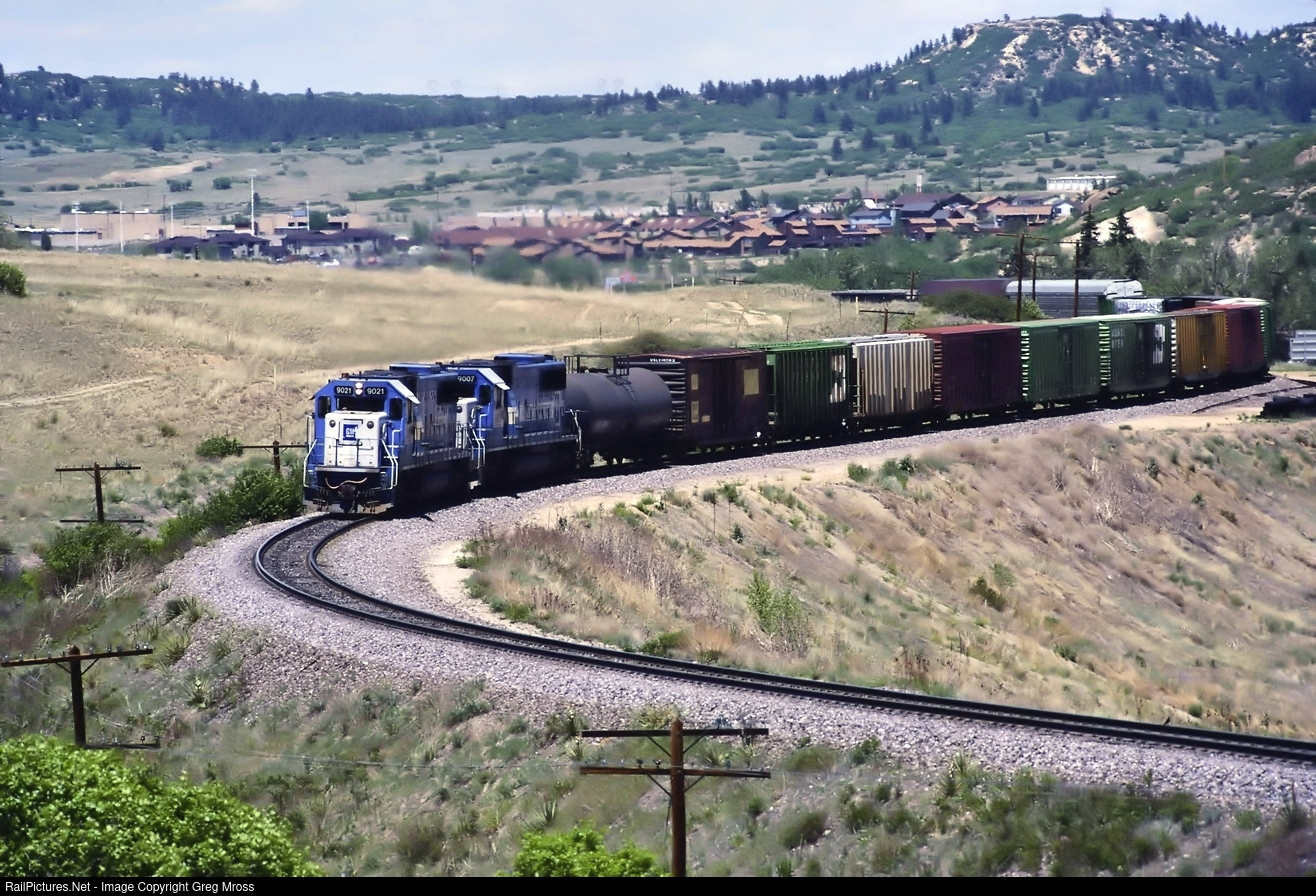 Oakway 9021 leads a southbound freight thru the S curve at Castle Rock, CO. in June of 1989.