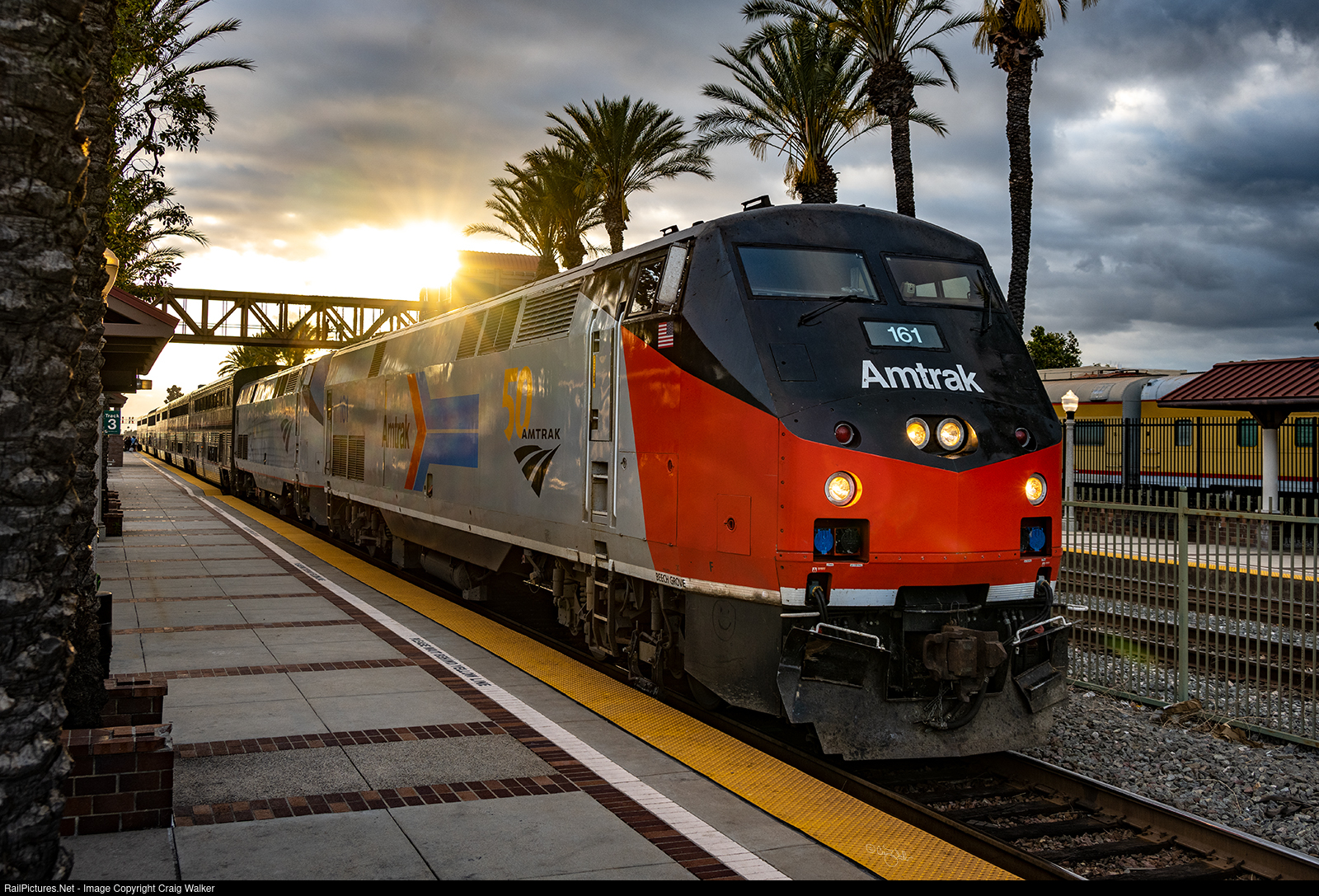 After departing Los Angeles, Amtrak train 4, the eastbound Southwest Chief, arrived at its first stop, Fullerton, 20 minutes behind schedule. But this allowed the setting sun, which had been obscured by clouds almost all day, to pop out for an appearance. One of Amtrak's 50th Anniversary Heritage locomotives, P42DC 161, wearing the carrier's original paint scheme (thus dubbed "Phase I"), leads the Chicago-bound train this evening, teamed with P42DC 194. (Fullerton, California – April 25, 2024)