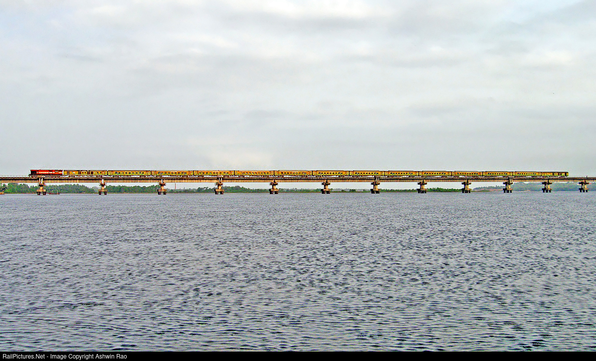 12223 Lokmanya Tilak Terminus (LTT) Ernakulam Duronto Express crusing through Sharavati B bridge at Honnavar. Image shot from boat. Konkan Railways.