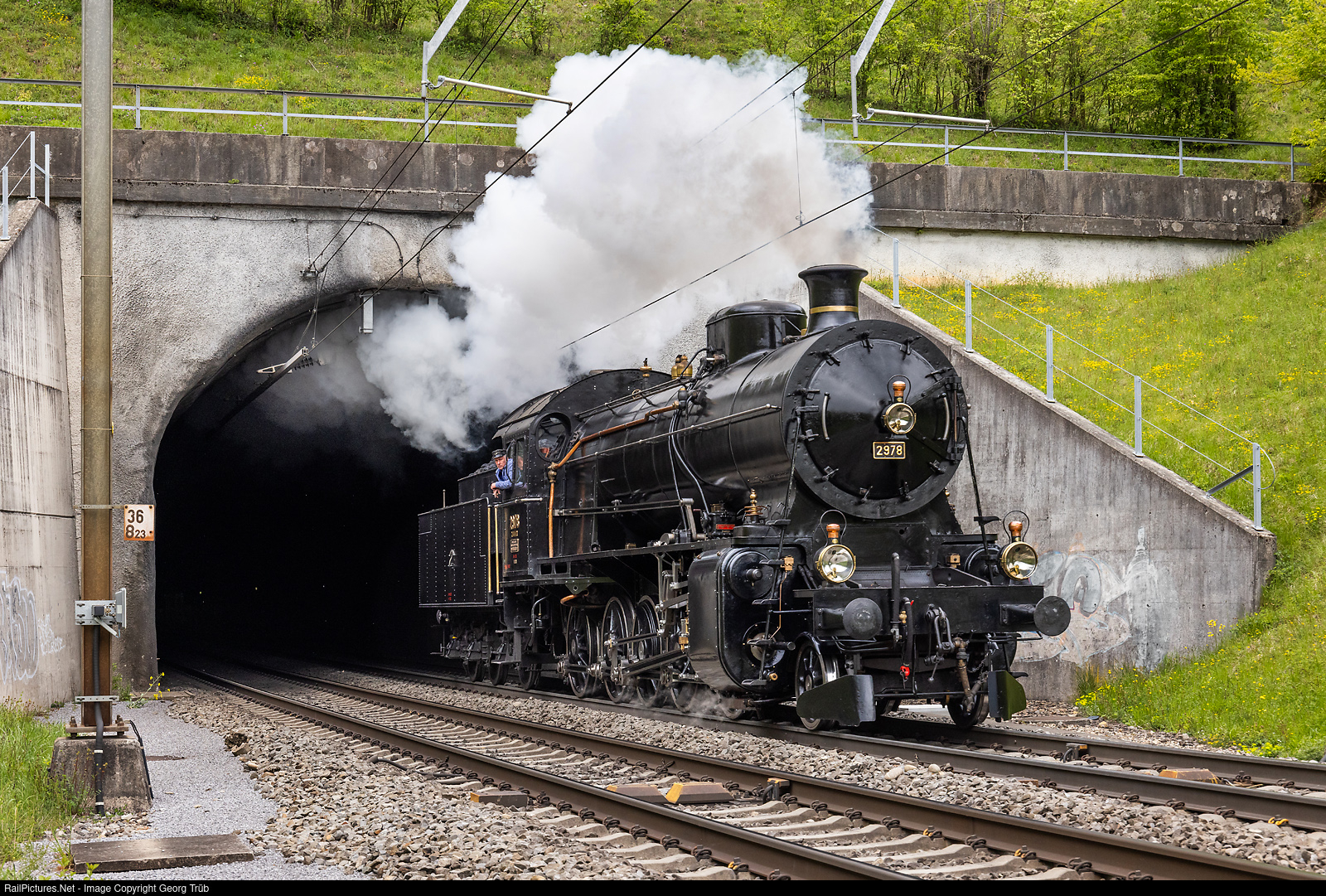 On this day, the 2-10-0 freight steam locomotive C 5/6 # 2978 from SBB Historic carried the school train from Basel Badischer Bahnhof via the old Hauenstein line to Olten. Before, she was running light from the home depot Brugg AG over the Bözberg line to Basel freight yard, leaving the 185 meter long Villnachern tunnel.